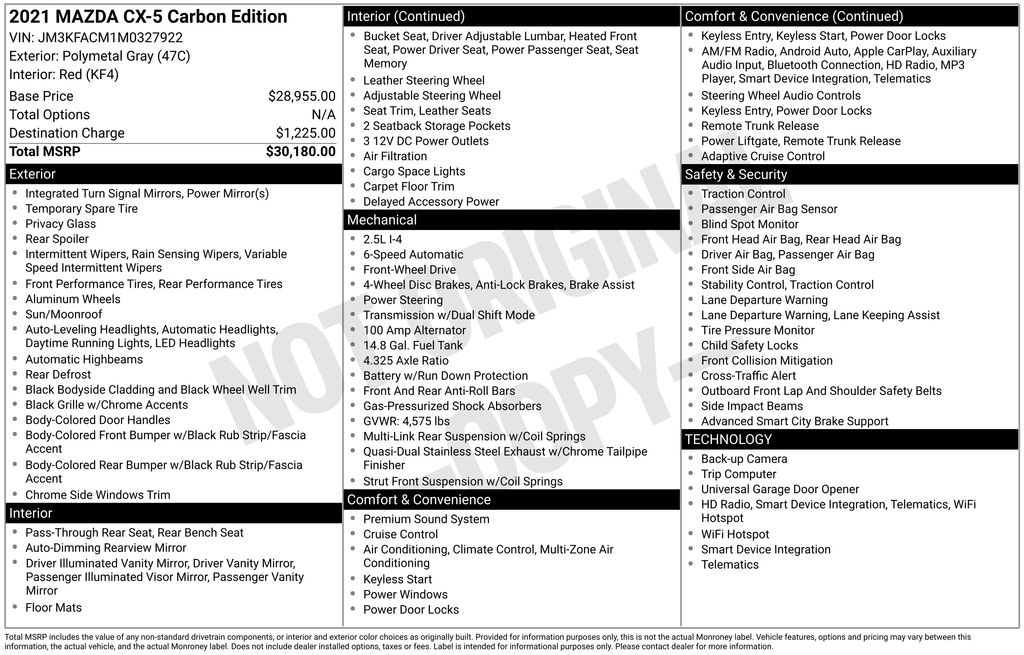 CERTIFIED BY CARFAX - ONE OWNER, BACKUP CAMERA, BLUETOOTH HANDS FREE, APPLE CARPLAY, POWER SEATS, LOCAL TRADE IN, MEMORY SEATS, POWER LIFTGATE, SUNROOF/MOONROOF, PUSH BUTTON START, CRUISE CONTROL, NON SMOKER, CX-5 Carbon Edition, 4D Sport Utility, SKYACTIV® 2.5L 4-Cylinder DOHC 16V, 6-Speed Automatic, FWD, Polymetal Gray, Red Leather, ABS brakes, Electronic Stability Control, Four wheel independent suspension, Front dual zone A/C, Fully automatic headlights, Low tire pressure warning, Remote keyless entry, Steering wheel mounted audio controls, 10 Speakers, 4-Wheel Disc Brakes, 4.325 Axle Ratio, Air Conditioning, Alloy wheels, AM/FM radio, AppLink/Apple CarPlay and Android Auto, Auto High-beam Headlights, Auto-dimming Rear-View mirror, Automatic temperature control, Bose 10-Speaker Premium Audio Sound System, Brake assist, Bumpers: body-color, Delay-off headlights, Driver door bin, Driver vanity mirror, Dual front impact airbags, Dual front side impact airbags, Exterior Parking Camera Rear, Front anti-roll bar, Front Bucket Seats, Front Center Armrest, Front reading lights, Garage door transmitter: HomeLink, Heated Front Bucket Seats, Heated front seats, Illuminated entry, Leather Seat Trim, Leather Shift Knob, Memory seat, Occupant sensing airbag, Outside temperature display, Overhead airbag, Overhead console, Panic alarm, Passenger door bin, Passenger vanity mirror, Power door mirrors, Power driver seat, Power Liftgate, Power moonroof, Power passenger seat, Power steering, Power windows, Radio data system, Radio: AM/FM/HD Audio System, Rain sensing wipers, Rear anti-roll bar, Rear reading lights, Rear seat center armrest, Rear window defroster, Rear window wiper, Speed control, Speed-sensing steering, Split folding rear seat, Spoiler, Tachometer, Telescoping steering wheel, Tilt steering wheel, Traction control, Trip computer, Turn signal indicator mirrors, Variably intermittent wipers, Wheels: 19" x 7J Aluminum Alloy, CX-5 Carbon Edition, 4D Sport Utility, SKYACTIV® 2.5L 4-Cylinder DOHC 16V, 6-Speed Automatic, FWD, Polymetal Gray, Red Leather, ABS brakes, Electronic Stability Control, Four wheel independent suspension, Front dual zone A/C, Fully automatic headlights, Low tire pressure warning, Remote keyless entry, Steering wheel mounted audio controls.