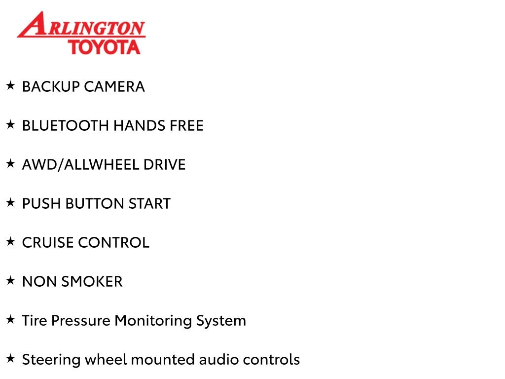 Prices do not include tax, tag, title, a pre-delivery service fee* of $894.00, an electronic registration filing fee* of $199.00 (*these charges represent costs and profits to the dealer for items such as inspecting, cleaning, and preparing documents related to the sale), and an Arlington Toyota Total Value Package of $1,889.00 (*these charges represent costs and profits to the dealer for items such as inspecting, cleaning, and preparing documents related to the sale). The final price is also subject to repair order reconditioning costs. Any price does not include dealer-installed accessories. All offers are mutually exclusive. All vehicles are subject to prior sale. See dealer for complete details.