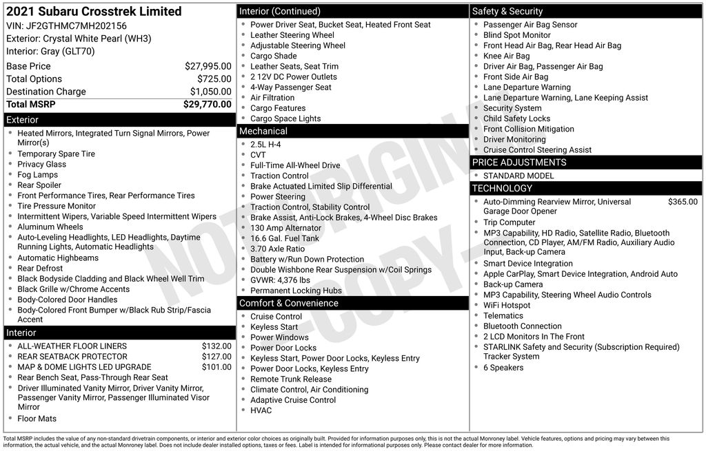 BACKUP CAMERA, BLUETOOTH HANDS FREE, AWD/ALLWHEEL DRIVE, POWER SEATS, PUSH BUTTON START, CRUISE CONTROL, NON SMOKER, Crosstrek Limited AWD, 4D Sport Utility, 2.5L DOHC, Lineartronic CVT, AWD, Crystal White Pearl, Gray Leather, ABS brakes, Electronic Stability Control, Four wheel independent suspension, Fully automatic headlights, Low tire pressure warning, Remote keyless entry, Steering wheel mounted audio controls, Turn signal indicator mirrors, 3.70 Axle Ratio, 4-Wheel Disc Brakes, 6 Speakers, Air Conditioning, All-Weather Floor Liners, Alloy wheels, AM/FM radio: SiriusXM, Anti-whiplash front head restraints, Auto High-beam Headlights, Auto-Dimming Mirror w/Compass & HomeLink, Automatic temperature control, Brake assist, Bumpers: body-color, CD player, Driver door bin, Driver vanity mirror, Dual front impact airbags, Dual front side impact airbags, Exterior Parking Camera Rear, Front anti-roll bar, Front Bucket Seats, Front Center Armrest, Front fog lights, Front reading lights, Heated door mirrors, Heated Front Bucket Seats, Heated front seats, Illuminated entry, Knee airbag, Leather-Trimmed Upholstery, Map & Dome Lights LED Upgrade, Occupant sensing airbag, Outside temperature display, Overhead airbag, Overhead console, Panic alarm, Passenger door bin, Passenger vanity mirror, Power door mirrors, Power driver seat, Power steering, Power windows, Radio data system, Radio: Subaru STARLINK 8.0" Multimedia Plus System, Rear anti-roll bar, Rear seat center armrest, Rear Seatback Protector, Rear window defroster, Rear window wiper, Security system, Speed control, Speed-sensing steering, Split folding rear seat, Spoiler, Standard Model, STARLINK/Apple CarPlay/Android Auto, Subaru STARLINK Smartphone Integration, Tachometer, Telescoping steering wheel, Tilt steering wheel, Traction control, Trip computer, Variably intermittent wipers, Wheels: 18" Alloy Machine Finish, Crosstrek Limited AWD, 4D Sport Utility, 2.5L DOHC, Lineartronic CVT, AWD, Crystal White Pearl, Gray Leather, ABS brakes, Electronic Stability Control, Four wheel independent suspension, Fully automatic headlights, Low tire pressure warning, Remote keyless entry, Steering wheel mounted audio controls, Turn signal indicator mirrors.