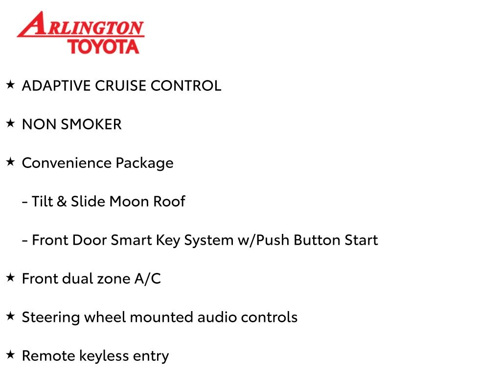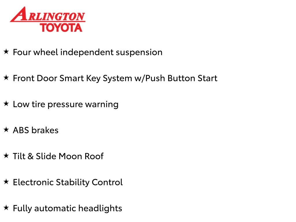 Prices do not include tax, tag, title, a pre-delivery service fee* of $894.00, an electronic registration filing fee* of $199.00 (*these charges represent costs and profits to the dealer for items such as inspecting, cleaning, and preparing documents related to the sale), and an Arlington Toyota Total Value Package of $1,889.00 (*these charges represent costs and profits to the dealer for items such as inspecting, cleaning, and preparing documents related to the sale). The final price is also subject to repair order reconditioning costs. Any price does not include dealer-installed accessories. All offers are mutually exclusive. All vehicles are subject to prior sale. See dealer for complete details.
