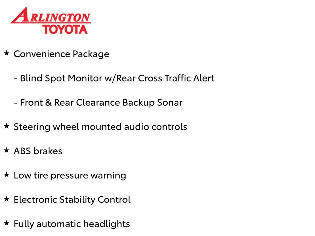 Prices do not include tax, tag, title, a pre-delivery service fee* of $894.00, an electronic registration filing fee* of $199.00 (*these charges represent costs and profits to the dealer for items such as inspecting, cleaning, and preparing documents related to the sale), and an Arlington Toyota Total Value Package of $1,889.00 (*these charges represent costs and profits to the dealer for items such as inspecting, cleaning, and preparing documents related to the sale). The final price is also subject to repair order reconditioning costs. Any price does not include dealer-installed accessories. All offers are mutually exclusive. All vehicles are subject to prior sale. See dealer for complete details.