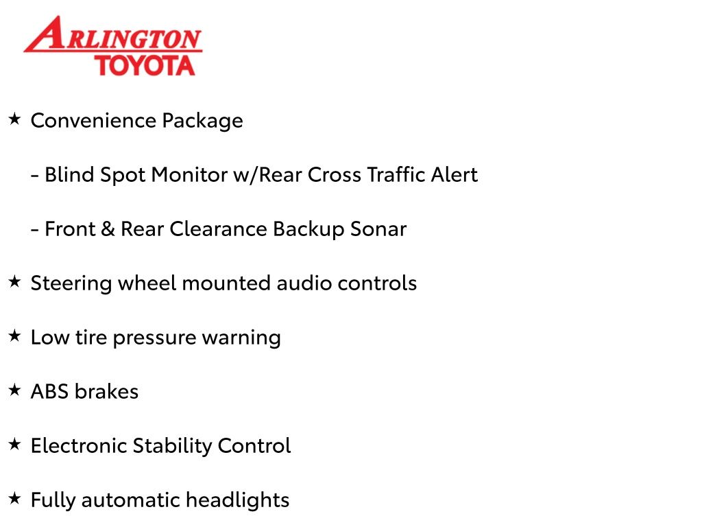 Prices do not include tax, tag, title, a pre-delivery service fee* of $894.00, an electronic registration filing fee* of $199.00 (*these charges represent costs and profits to the dealer for items such as inspecting, cleaning, and preparing documents related to the sale), and an Arlington Toyota Total Value Package of $1,889.00 (*these charges represent costs and profits to the dealer for items such as inspecting, cleaning, and preparing documents related to the sale). The final price is also subject to repair order reconditioning costs. Any price does not include dealer-installed accessories. All offers are mutually exclusive. All vehicles are subject to prior sale. See dealer for complete details.