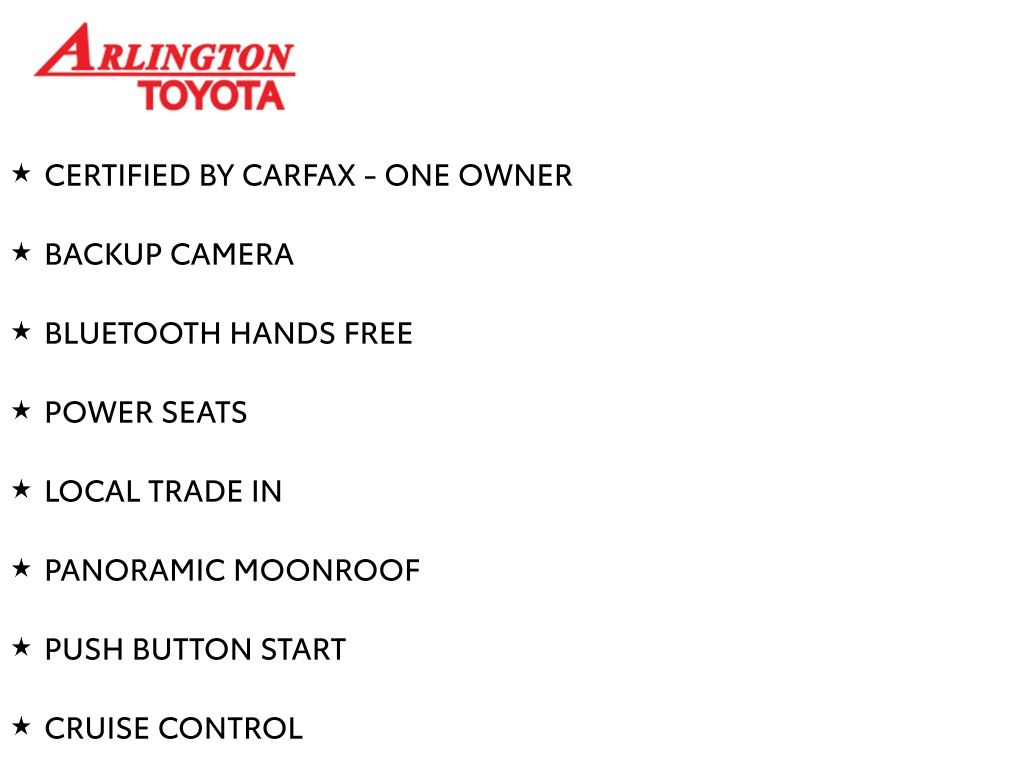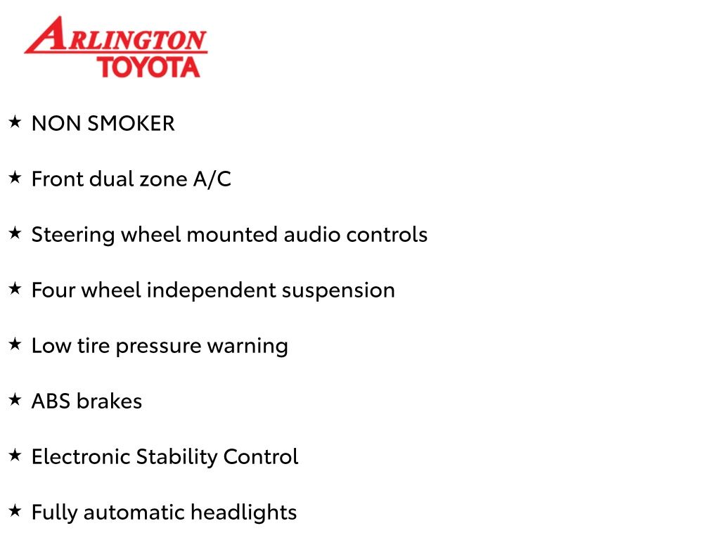 Prices do not include tax, tag, title, a pre-delivery service fee* of $894.00, an electronic registration filing fee* of $199.00 (*these charges represent costs and profits to the dealer for items such as inspecting, cleaning, and preparing documents related to the sale), and an Arlington Toyota Total Value Package of $1,889.00 (*these charges represent costs and profits to the dealer for items such as inspecting, cleaning, and preparing documents related to the sale). The final price is also subject to repair order reconditioning costs. Any price does not include dealer-installed accessories. All offers are mutually exclusive. All vehicles are subject to prior sale. See dealer for complete details.