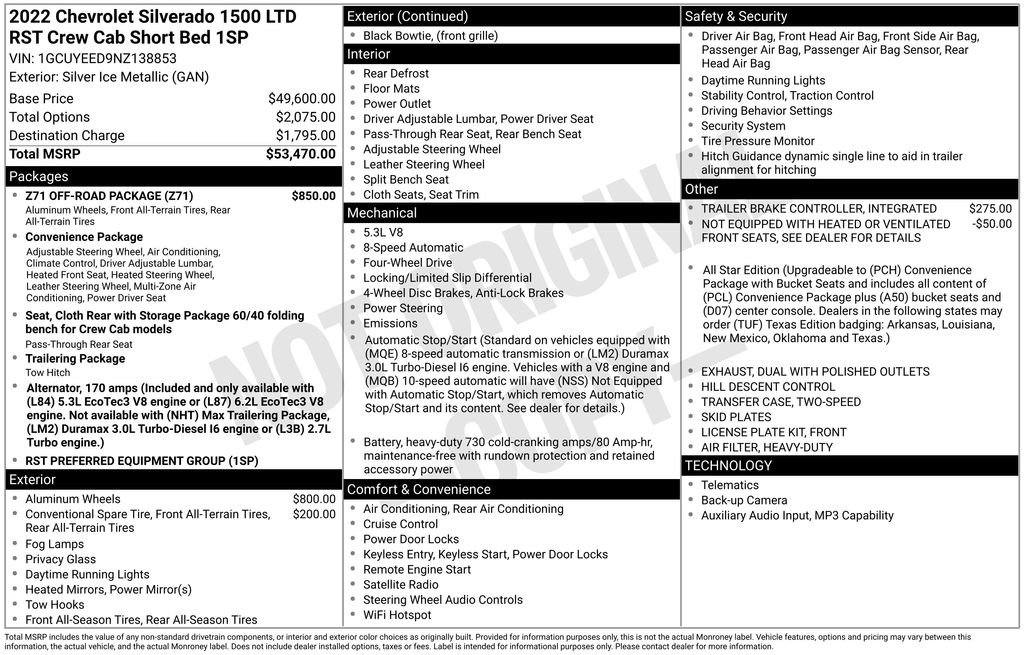 BACKUP CAMERA, BLUETOOTH HANDS FREE, ANDROID AUTO, APPLE CARPLAY, 4X4/FOUR WHEEL DRIVE, BED LINER, TOW PACKAGE, CRUISE CONTROL, NON SMOKER, Silverado 1500 LTD RST 4X4, 4D Crew Cab, EcoTec3 5.3L V8, 8-Speed Automatic, 4WD, Silver Ice Metallic, Black Cloth, Dual Exhaust w/Polished Outlets, Fully automatic headlights, Heavy-Duty Air Filter, Hill Descent Control, Off-Road Suspension, Z71 Off-Road Package, 10-Way Power Driver Seat w/Lumbar, 12-Volt Rear Auxiliary Power Outlet, 2 USB Ports (First Row), 220 Amp Alternator, 3.23 Rear Axle Ratio, 4-Wheel Disc Brakes, 4.2" Diagonal Color Display Driver Info Center, 40/20/40 Front Split-Bench Seat, 6 Speakers, 6-Speaker Audio System, ABS brakes, Air Conditioning, All-Star Edition, Alloy wheels, AM/FM radio: SiriusXM, Apple CarPlay/Android Auto, Auto-Locking Rear Differential, Automatic temperature control, Bluetooth® For Phone, Body Color Grille, Brake assist, Bumpers: body-color, Chevrolet Connected Access Capable, Cloth Rear Seat w/Storage Package, Cloth Seat Trim, Color-Keyed Carpeting Floor Covering, Compass, Convenience Package, Deep-Tinted Glass, Delay-off headlights, Driver door bin, Driver vanity mirror, Dual front impact airbags, Dual front side impact airbags, Dual-Zone Automatic Climate Control, Electric Rear-Window Defogger, Electronic Cruise Control, Electronic Stability Control, EZ Lift Power Lock & Release Tailgate, Front anti-roll bar, Front Center Armrest w/Storage, Front dual zone A/C, Front fog lights, Front Frame-Mounted Black Recovery Hooks, Front LED Fog Lamps, Front License Plate Kit, Front reading lights, Front Rubberized Vinyl Floor Mats, Front wheel independent suspension, Heated door mirrors, Heated Driver & Front Outboard Passenger Seats, Heated front seats, Heated Steering Wheel, Heated steering wheel, Heavy Duty Suspension, High Gloss Black Mirror Caps, Hitch Guidance, Illuminated entry, Integrated Trailer Brake Controller, Keyless Open & Start, Leather Wrapped Steering Wheel, LED Cargo Area Lighting, Low tire pressure warning, Manual Tilt/Telescoping Steering Column, Not Equipped w/Heated/Ventilated Front Seats, Occupant sensing airbag, OnStar & Chevrolet Connected Services Capable, Outside temperature display, Overhead airbag, Overhead console, Panic alarm, Passenger door bin, Passenger vanity mirror, Power Door Locks, Power door mirrors, Power driver seat, Power Front Windows w/Driver Express Up/Down, Power Front Windows w/Passenger Express Down, Power Rear Windows w/Express Down, Power steering, Power windows, Preferred Equipment Group 1SP, Premium audio system: Chevrolet Infotainment 3, Radio data system, Radio: Chevrolet Infotainment 3 System, Rear 60/40 Folding Bench Seat (Folds Up), Rear Dual USB Charging-Only Ports, Rear reading lights, Rear Rubberized-Vinyl Floor Mats, Rear seat center armrest, Rear step bumper, Rear Vision Camera, Rear window defroster, Remote keyless entry, Remote Vehicle Starter System, Security system, SiriusXM Radio, Speed control, Speed-sensing steering, Split folding rear seat, Standard Tailgate, Steering Wheel Audio Controls, Steering wheel mounted audio controls, Tachometer, Telescoping steering wheel, Theft Deterrent System (Unauthorized Entry), Tilt steering wheel, Traction control, Trailering Package, Trip computer, Variably intermittent wipers, Voltmeter, Wheels: 18" x 8.5" Bright Silver Painted Aluminum, Wheels: 20" x 9" Painted Aluminum, Wi-Fi Hot Spot Capable, Silverado 1500 LTD RST 4X4, 4D Crew Cab, EcoTec3 5.3L V8, 8-Speed Automatic, 4WD, Silver Ice Metallic, Black Cloth, Dual Exhaust w/Polished Outlets, Fully automatic headlights, Heavy-Duty Air Filter, Hill Descent Control, Off-Road Suspension, Z71 Off-Road Package.