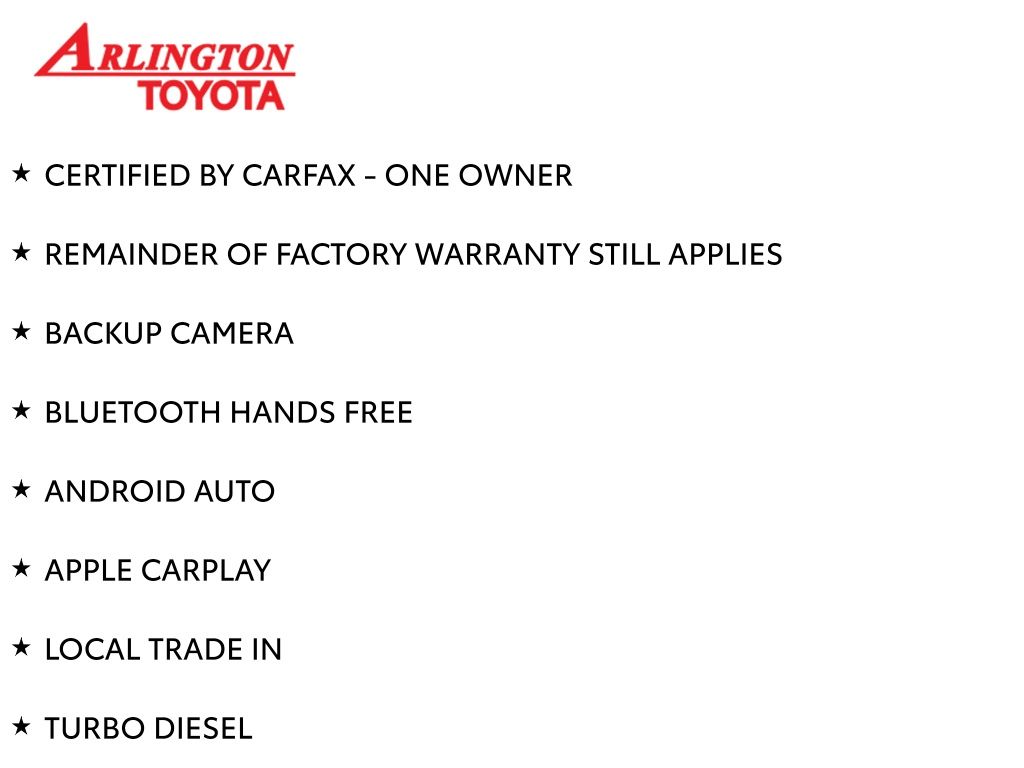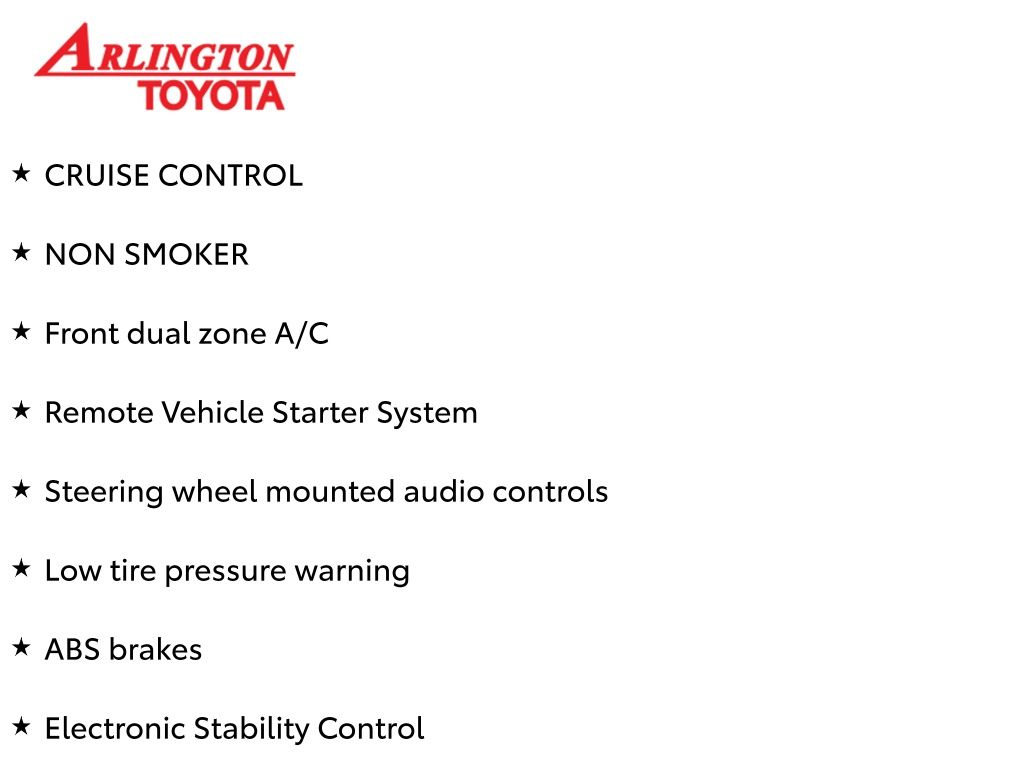 Prices do not include tax, tag, title, a pre-delivery service fee* of $894.00, an electronic registration filing fee* of $199.00 (*these charges represent costs and profits to the dealer for items such as inspecting, cleaning, and preparing documents related to the sale), and an Arlington Toyota Total Value Package of $1,889.00 (*these charges represent costs and profits to the dealer for items such as inspecting, cleaning, and preparing documents related to the sale). The final price is also subject to repair order reconditioning costs. Any price does not include dealer-installed accessories. All offers are mutually exclusive. All vehicles are subject to prior sale. See dealer for complete details.