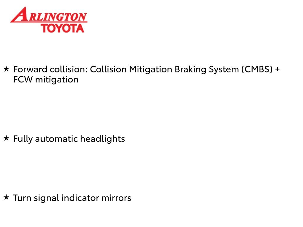 Prices do not include tax, tag, title, a pre-delivery service fee* of $894.00, an electronic registration filing fee* of $199.00 (*these charges represent costs and profits to the dealer for items such as inspecting, cleaning, and preparing documents related to the sale), and an Arlington Toyota Total Value Package of $1,889.00 (*these charges represent costs and profits to the dealer for items such as inspecting, cleaning, and preparing documents related to the sale). The final price is also subject to repair order reconditioning costs. Any price does not include dealer-installed accessories. All offers are mutually exclusive. All vehicles are subject to prior sale. See dealer for complete details.