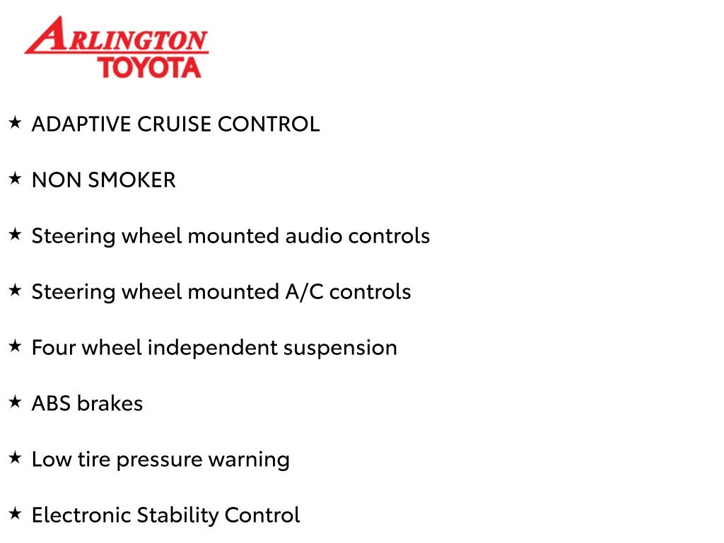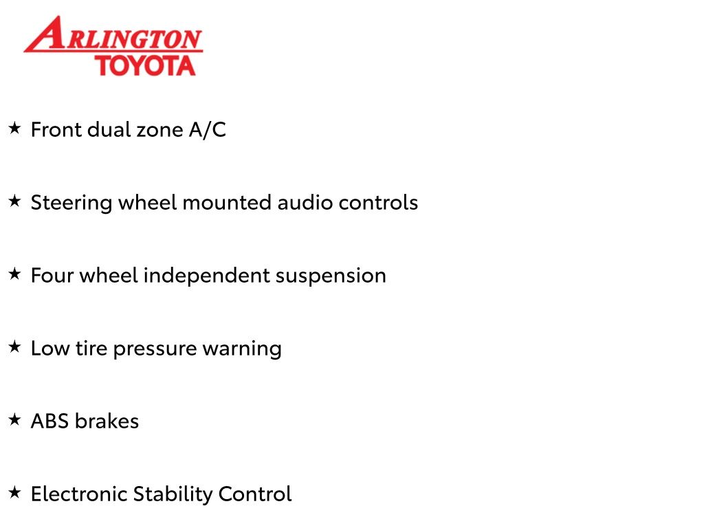 Prices do not include tax, tag, title, a pre-delivery service fee* of $894.00, an electronic registration filing fee* of $199.00 (*these charges represent costs and profits to the dealer for items such as inspecting, cleaning, and preparing documents related to the sale), and an Arlington Toyota Total Value Package of $1,889.00 (*these charges represent costs and profits to the dealer for items such as inspecting, cleaning, and preparing documents related to the sale). The final price is also subject to repair order reconditioning costs. Any price does not include dealer-installed accessories. All offers are mutually exclusive. All vehicles are subject to prior sale. See dealer for complete details.