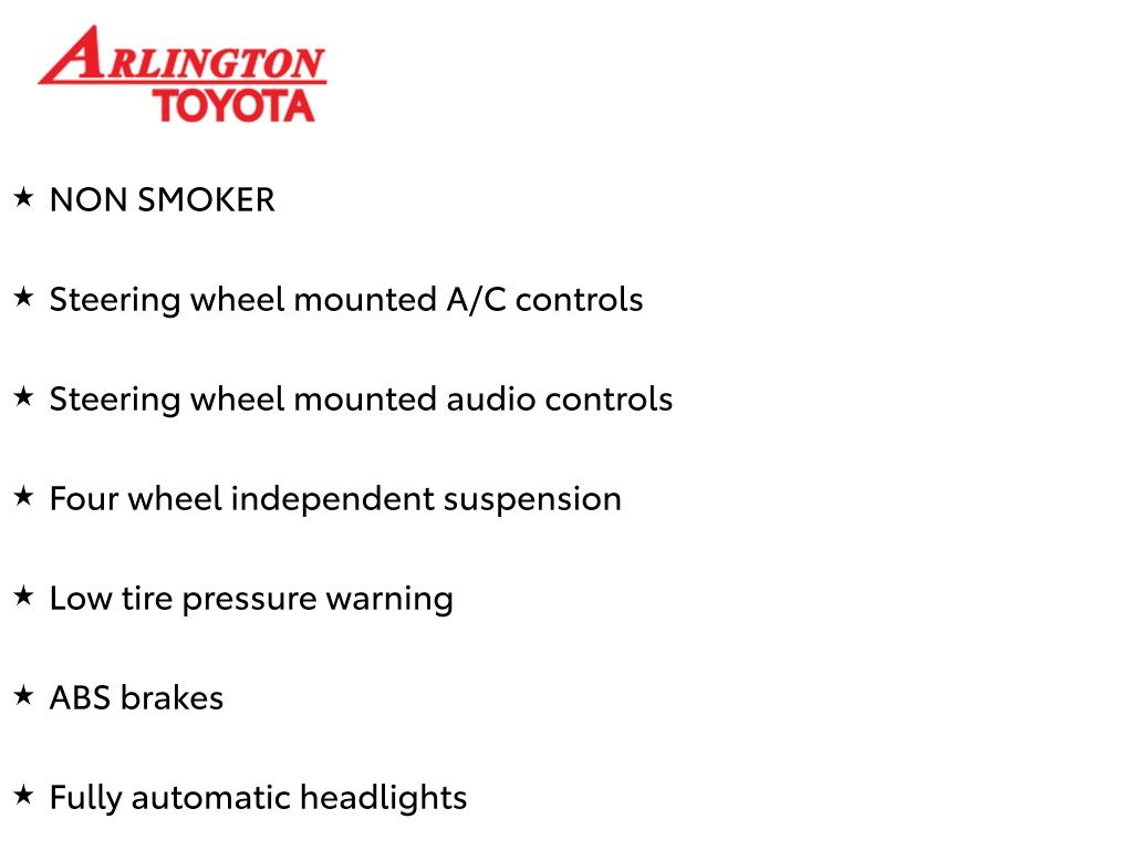 Prices do not include tax, tag, title, a pre-delivery service fee* of $894.00, an electronic registration filing fee* of $199.00 (*these charges represent costs and profits to the dealer for items such as inspecting, cleaning, and preparing documents related to the sale), and an Arlington Toyota Total Value Package of $1,889.00 (*these charges represent costs and profits to the dealer for items such as inspecting, cleaning, and preparing documents related to the sale). The final price is also subject to repair order reconditioning costs. Any price does not include dealer-installed accessories. All offers are mutually exclusive. All vehicles are subject to prior sale. See dealer for complete details.