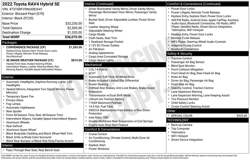 BACKUP CAMERA, BLUETOOTH HANDS FREE, ANDROID AUTO, APPLE CARPLAY, AWD/ALLWHEEL DRIVE, POWER SEATS, LOCAL TRADE IN, POWER LIFTGATE, SUNROOF/MOONROOF, PUSH BUTTON START, LANE DEPARTURE, ADAPTIVE CRUISE CONTROL, NON SMOKER, RAV4 Hybrid SE AWD, 4D Sport Utility, 2.5L 4-Cylinder, eCVT, AWD, Blizzard Pearl, Black Cloth, ABS brakes, Convenience Package, Electronic Stability Control, Four wheel independent suspension, Front Door Smart Key System w/Push Button Start, Front dual zone A/C, Fully automatic headlights, Low tire pressure warning, Remote keyless entry, Steering wheel mounted audio controls, Tilt & Slide Moon Roof, 4-Wheel Disc Brakes, 6 Speakers, Air Conditioning, Alloy wheels, AM/FM radio: SiriusXM, AM/FM Stereo, Apple CarPlay/Android Auto, Auto High-beam Headlights, Automatic temperature control, Axle Ratio: TBD, Brake assist, Bumpers: body-color, Delay-off headlights, Driver door bin, Driver vanity mirror, Dual front impact airbags, Dual front side impact airbags, Exterior Parking Camera Rear, Fabric Seat Trim (FC), Front anti-roll bar, Front Bucket Seats, Front Center Armrest, Front fog lights, Front reading lights, Front Sport Seats, Heated door mirrors, Illuminated entry, Knee airbag, Lane Departure Warning System, Leather Shift Knob, Occupant sensing airbag, Outside temperature display, Overhead airbag, Overhead console, Panic alarm, Passenger door bin, Passenger vanity mirror, Power door mirrors, Power driver seat, Power Liftgate, Power steering, Power windows, Radio data system, Rear anti-roll bar, Rear seat center armrest, Rear window defroster, Rear window wiper, Roof rack: rails only, Speed control, Speed-sensing steering, Split folding rear seat, Spoiler, Telescoping steering wheel, Tilt steering wheel, Traction control, Trip computer, Turn signal indicator mirrors, Variably intermittent wipers, Wheels: 18" x 7.0J Silver Aluminum Alloy, RAV4 Hybrid SE AWD, 4D Sport Utility, 2.5L 4-Cylinder, eCVT, AWD, Blizzard Pearl, Black Cloth, ABS brakes, Convenience Package, Electronic Stability Control, Four wheel independent suspension, Front Door Smart Key System w/Push Button Start, Front dual zone A/C, Fully automatic headlights, Low tire pressure warning, Remote keyless entry, Steering wheel mounted audio controls, Tilt & Slide Moon Roof.