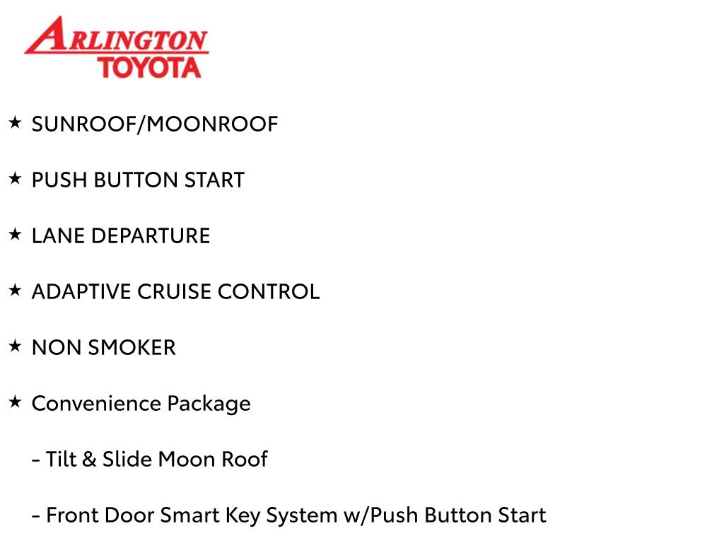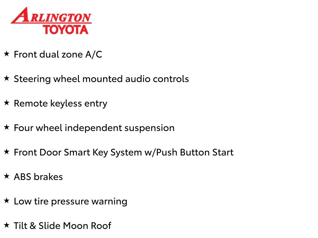 Prices do not include tax, tag, title, a pre-delivery service fee* of $894.00, an electronic registration filing fee* of $199.00 (*these charges represent costs and profits to the dealer for items such as inspecting, cleaning, and preparing documents related to the sale), and an Arlington Toyota Total Value Package of $1,889.00 (*these charges represent costs and profits to the dealer for items such as inspecting, cleaning, and preparing documents related to the sale). The final price is also subject to repair order reconditioning costs. Any price does not include dealer-installed accessories. All offers are mutually exclusive. All vehicles are subject to prior sale. See dealer for complete details.
