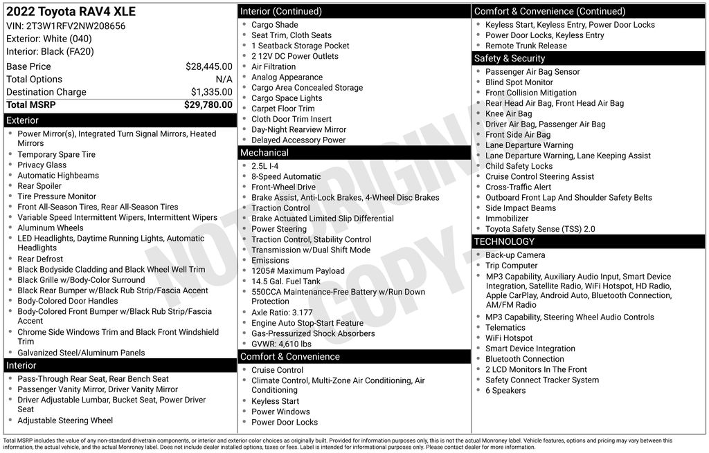 CERTIFIED BY CARFAX - ONE OWNER, REMAINDER OF FACTORY WARRANTY STILL APPLIES, BACKUP CAMERA, BLUETOOTH HANDS FREE, ANDROID AUTO, APPLE CARPLAY, POWER SEATS, CRUISE CONTROL, NON SMOKER, RAV4 XLE, 4D Sport Utility, 2.5L 4-Cylinder DOHC Dual VVT-i, 8-Speed Automatic, FWD, White, Black Cloth, ABS brakes, Electronic Stability Control, Four wheel independent suspension, Front dual zone A/C, Fully automatic headlights, Low tire pressure warning, Remote keyless entry, Steering wheel mounted audio controls, Turn signal indicator mirrors, 4-Wheel Disc Brakes, 6 Speakers, Air Conditioning, Alloy wheels, AM/FM radio: SiriusXM, AM/FM Stereo, Apple CarPlay/Android Auto, Auto High-beam Headlights, Automatic temperature control, Axle Ratio: 3.177, Brake assist, Bumpers: body-color, Delay-off headlights, Driver door bin, Driver vanity mirror, Dual front impact airbags, Dual front side impact airbags, Exterior Parking Camera Rear, Fabric Seat Trim, Front anti-roll bar, Front Bucket Seats, Front Center Armrest, Front reading lights, Heated door mirrors, Illuminated entry, Knee airbag, Occupant sensing airbag, Outside temperature display, Overhead airbag, Overhead console, Panic alarm, Passenger door bin, Passenger vanity mirror, Power door mirrors, Power driver seat, Power steering, Power windows, Radio data system, Rear anti-roll bar, Rear seat center armrest, Rear window defroster, Rear window wiper, Roof rack: rails only, Speed control, Speed-sensing steering, Split folding rear seat, Spoiler, Tachometer, Telescoping steering wheel, Tilt steering wheel, Traction control, Trip computer, Variably intermittent wipers, Wheels: 17" 5-Spoke Silver Alloy, RAV4 XLE, 4D Sport Utility, 2.5L 4-Cylinder DOHC Dual VVT-i, 8-Speed Automatic, FWD, White, Black Cloth, ABS brakes, Electronic Stability Control, Four wheel independent suspension, Front dual zone A/C, Fully automatic headlights, Low tire pressure warning, Remote keyless entry, Steering wheel mounted audio controls, Turn signal indicator mirrors.