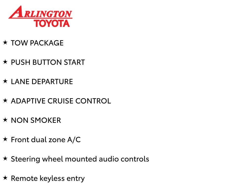 Prices do not include tax, tag, title, a pre-delivery service fee* of $894.00, an electronic registration filing fee* of $199.00 (*these charges represent costs and profits to the dealer for items such as inspecting, cleaning, and preparing documents related to the sale), and an Arlington Toyota Total Value Package of $1,889.00 (*these charges represent costs and profits to the dealer for items such as inspecting, cleaning, and preparing documents related to the sale). The final price is also subject to repair order reconditioning costs. Any price does not include dealer-installed accessories. All offers are mutually exclusive. All vehicles are subject to prior sale. See dealer for complete details.
