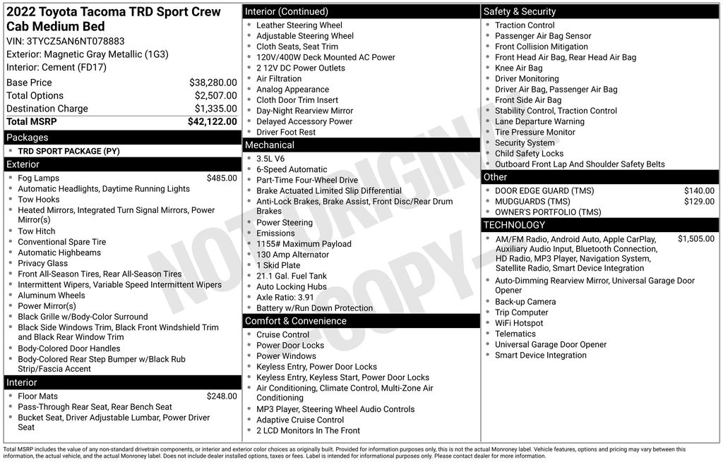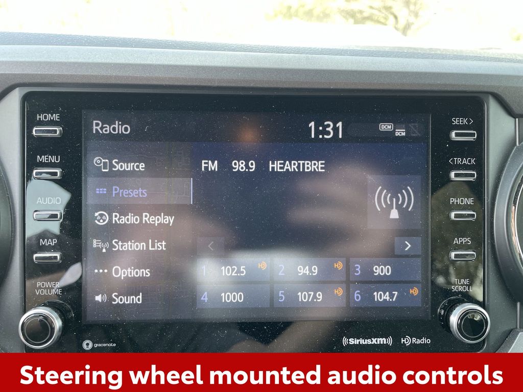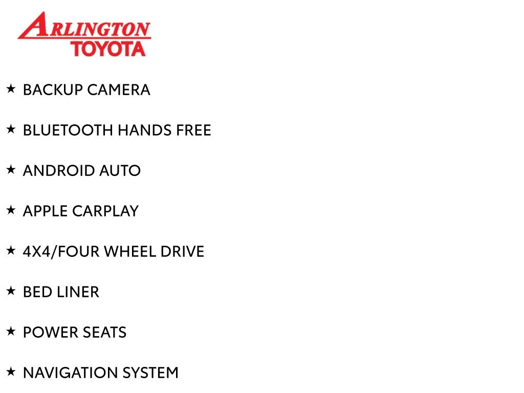 BACKUP CAMERA, BLUETOOTH HANDS FREE, ANDROID AUTO, APPLE CARPLAY, 4X4/FOUR WHEEL DRIVE, BED LINER, POWER SEATS, NAVIGATION SYSTEM, TOW PACKAGE, PUSH BUTTON START, LANE DEPARTURE, ADAPTIVE CRUISE CONTROL, NON SMOKER, Tacoma TRD Sport 4X4, 4D Double Cab, 3.5L V6 PDI DOHC 24V LEV3-ULEV70 278hp, 6-Speed Automatic, 4WD, Magnetic Gray, Cement Cloth, ABS brakes, Electronic Stability Control, Front dual zone A/C, Low tire pressure warning, Remote keyless entry, Steering wheel mounted audio controls, Turn signal indicator mirrors, 120V/400W Deck Mounted AC Power, 6 Speakers, Air Conditioning, All Weather Floor Liner & Door Sill Protector (TMS), Alloy wheels, AM/FM radio: SiriusXM, Anti-whiplash front head restraints, Apple CarPlay/Android Auto, Auto High-beam Headlights, Auto-dimming Rear-View mirror, Auto-Dimming Rearview Mirror w/HomeLink, Automatic temperature control, Axle Ratio: 3.91, Brake assist, Bumpers: body-color, Color-Keyed Overfenders, Door Edge Guard (TMS), Driver door bin, Dual front impact airbags, Dual front side impact airbags, Engine Immobilizer, Exterior Parking Camera Rear, Fabric Seat Trim (FD), Front anti-roll bar, Front Bucket Seats, Front Center Armrest, Front fog lights, Front reading lights, Front Seats, Garage door transmitter: HomeLink, Heated door mirrors, Illuminated entry, Knee airbag, Leather Shift Knob, LED Fog Lamp w/Black Bezel, Mudguards (TMS), Occupant sensing airbag, Outside temperature display, Overhead airbag, Overhead console, Owner's Portfolio (TMS), Panic alarm, Passenger door bin, Power Color Turn Mirror, Power door mirrors, Power driver seat, Power Sliding Rear Window w/Privacy Glass, Power steering, Power windows, Radio: AM/FM Radio, Radio: Premium w/AM/FM/Nav/App Suite, Rear step bumper, Security system, Smart Key w/Push Button Start, Speed control, Speed-sensing steering, Split folding rear seat, Tachometer, Telescoping steering wheel, Tilt steering wheel, Traction control, TRD Sport Package, Trip computer, Variably intermittent wipers, Wheels: 17" x 7.5J Machined Alloy, Tacoma TRD Sport 4X4, 4D Double Cab, 3.5L V6 PDI DOHC 24V LEV3-ULEV70 278hp, 6-Speed Automatic, 4WD, Magnetic Gray, Cement Cloth, ABS brakes, Electronic Stability Control, Front dual zone A/C, Low tire pressure warning, Remote keyless entry, Steering wheel mounted audio controls, Turn signal indicator mirrors.