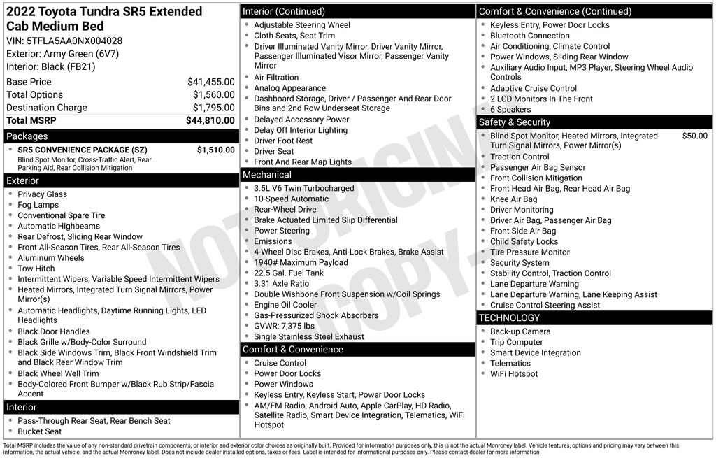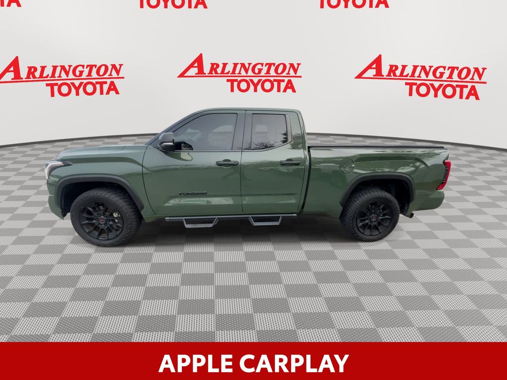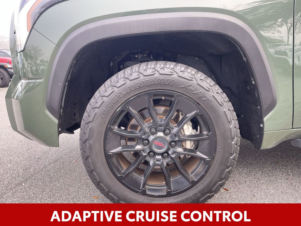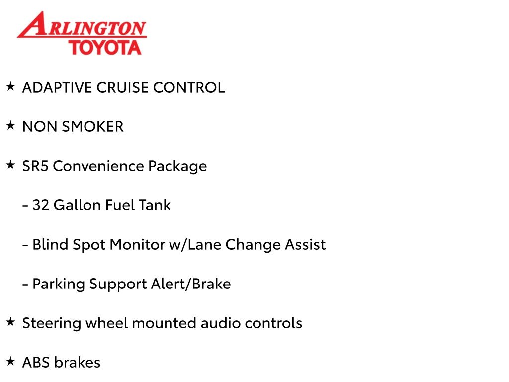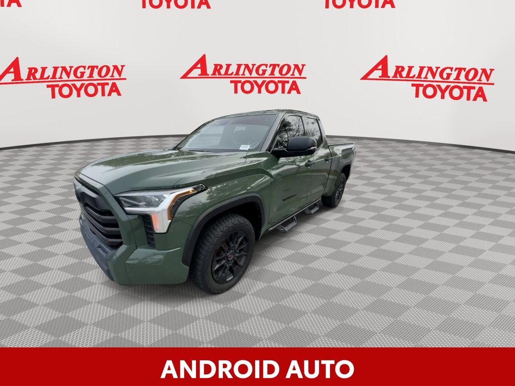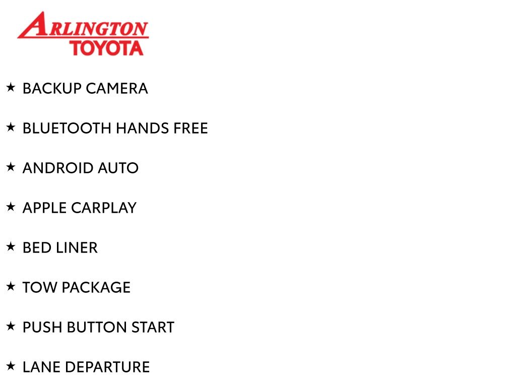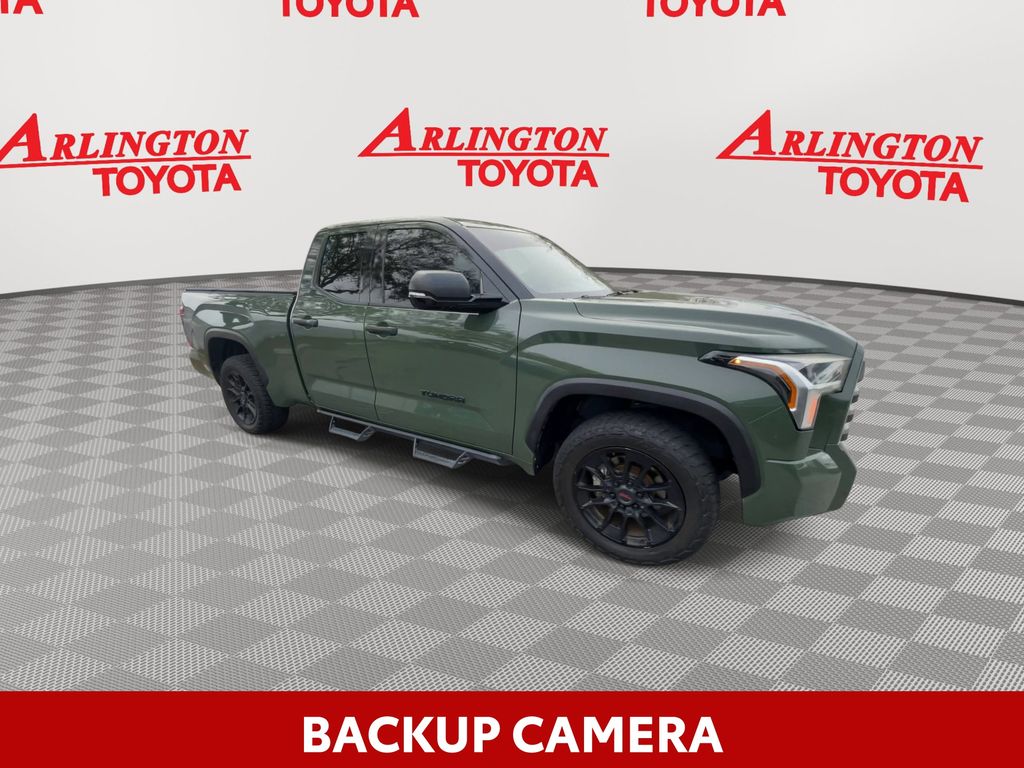 BACKUP CAMERA, BLUETOOTH HANDS FREE, ANDROID AUTO, APPLE CARPLAY, BED LINER, TOW PACKAGE, PUSH BUTTON START, LANE DEPARTURE, ADAPTIVE CRUISE CONTROL, NON SMOKER, Tundra SR5, 4D Double Cab, 3.4L V6, 10-Speed Automatic, RWD, Army Green, Black Cloth, 32 Gallon Fuel Tank, ABS brakes, Blind Spot Monitor w/Lane Change Assist, Low tire pressure warning, Parking Support Alert/Brake, SR5 Convenience Package, Steering wheel mounted audio controls, 18" x 8" Alloy Wheels, 3.31 Axle Ratio, 4-Wheel Disc Brakes, 6 Speakers, Air Conditioning, Alloy wheels, AM/FM Radio, AM/FM radio: SiriusXM, Apple CarPlay/Android Auto, Auto High-beam Headlights, Automatic temperature control, Blind Spot Monitor, Brake assist, Bumpers: body-color, Delay-off headlights, Driver door bin, Driver vanity mirror, Dual front impact airbags, Dual front side impact airbags, Electronic Stability Control, Exterior Parking Camera Rear, Fabric Seat Trim, Front anti-roll bar, Front Bucket Seats, Front Center Armrest, Front fog lights, Front reading lights, Front wheel independent suspension, Fully automatic headlights, Heated door mirrors, Heated Power Black Outside Mirrors, Illuminated entry, Knee airbag, Occupant sensing airbag, Outside temperature display, Overhead airbag, Overhead console, Panic alarm, Passenger door bin, Passenger vanity mirror, Power door mirrors, Power steering, Power windows, Radio data system, Rear reading lights, Rear step bumper, Rear window defroster, Remote keyless entry, Security system, Speed control, Speed-sensing steering, Split folding rear seat, Tachometer, Telescoping steering wheel, Tilt steering wheel, Traction control, TRD Wheel & Predator Drop Step Package (TMS), Trip computer, Turn signal indicator mirrors, Variably intermittent wipers, Voltmeter, Tundra SR5, 4D Double Cab, 3.4L V6, 10-Speed Automatic, RWD, Army Green, Black Cloth, 32 Gallon Fuel Tank, ABS brakes, Blind Spot Monitor w/Lane Change Assist, Low tire pressure warning, Parking Support Alert/Brake, SR5 Convenience Package, Steering wheel mounted audio controls.