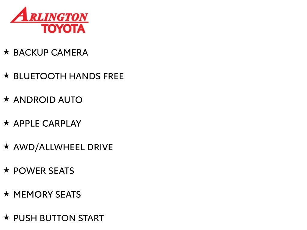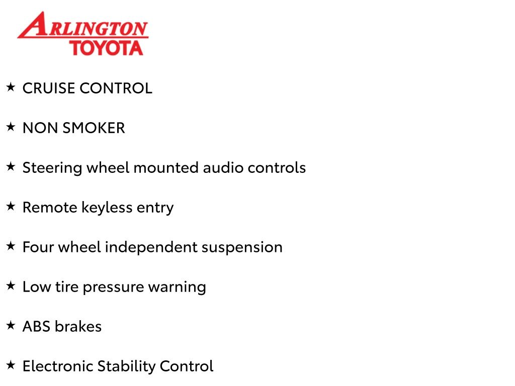 Prices do not include tax, tag, title, a pre-delivery service fee* of $894.00, an electronic registration filing fee* of $199.00 (*these charges represent costs and profits to the dealer for items such as inspecting, cleaning, and preparing documents related to the sale), and an Arlington Toyota Total Value Package of $1,889.00 (*these charges represent costs and profits to the dealer for items such as inspecting, cleaning, and preparing documents related to the sale). The final price is also subject to repair order reconditioning costs. Any price does not include dealer-installed accessories. All offers are mutually exclusive. All vehicles are subject to prior sale. See dealer for complete details.