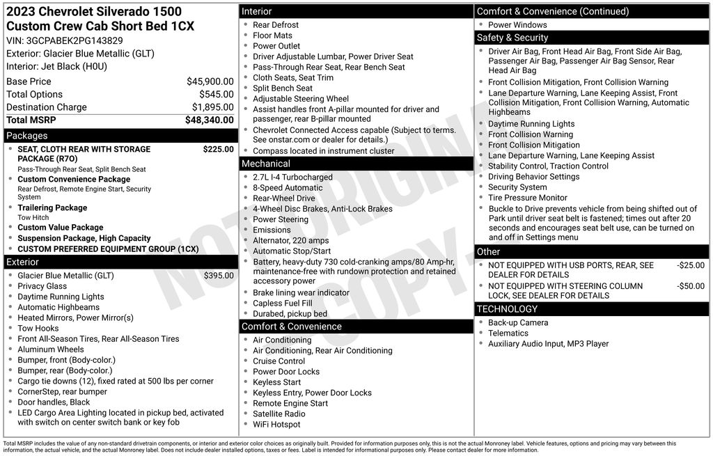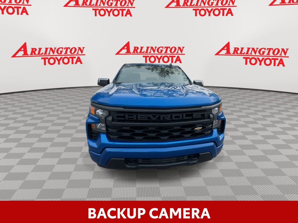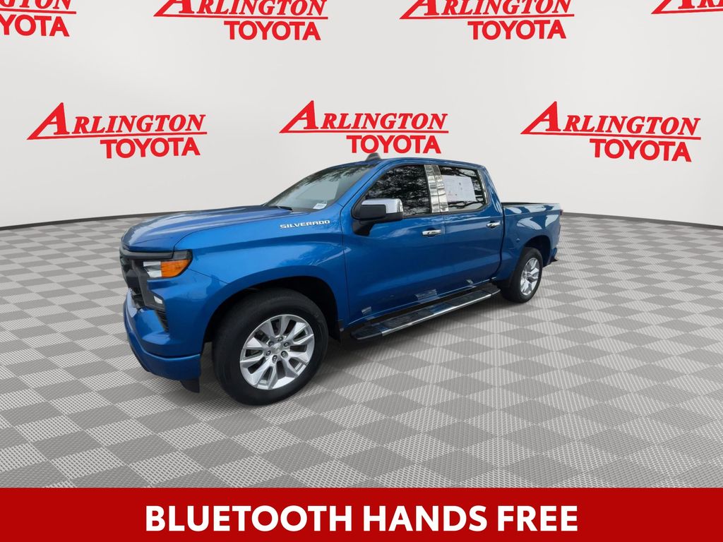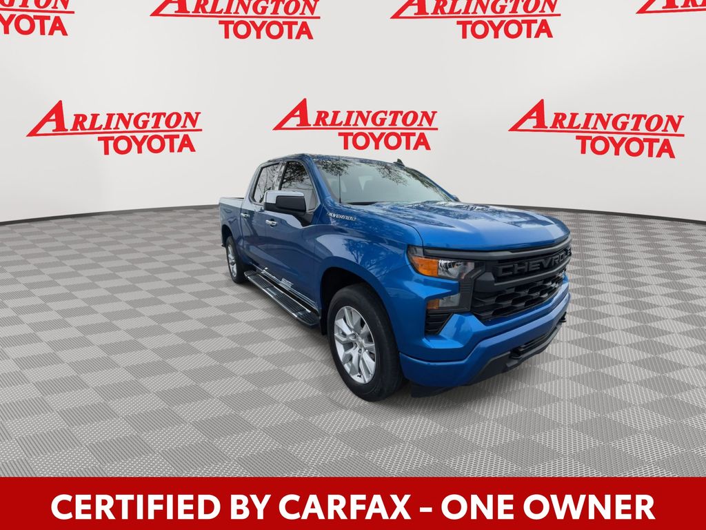 CERTIFIED BY CARFAX - ONE OWNER, BACKUP CAMERA, BLUETOOTH HANDS FREE, ANDROID AUTO, APPLE CARPLAY, RUNNING BOARDS, TOW PACKAGE, PUSH BUTTON START, CRUISE CONTROL, NON SMOKER, Silverado 1500 Custom, 4D Crew Cab, 2.7L Turbo, 8-Speed Automatic, RWD, Glacier Blue Metallic, Black Cloth, ABS brakes, Electronic Stability Control, Fully automatic headlights, Low tire pressure warning, Remote Vehicle Starter System, 10-Way Power Driver Seat w/Lumbar, 120-Volt Bed Mounted Power Outlet, 120-Volt Instrument Panel Power Outlet, 3.42 Rear Axle Ratio, 3.5" Monochromatic Display Driver Info Center, 4-Wheel Disc Brakes, 40/20/40 Front Split-Bench Seat, 6 Speakers, 6-Speaker Audio System, Air Conditioning, Alloy wheels, AM/FM radio: SiriusXM, Apple CarPlay/Android Auto, Auto High-beam Headlights, Automatic Emergency Braking, Bluetooth® For Phone, Brake assist, Bumpers: body-color, Chevrolet Connected Access Capable, Cloth Rear Seat w/Storage Package, Cloth Seat Trim, Color-Keyed Carpeting Floor Covering, Compass, Custom Convenience Package, Custom Value Package, Deep-Tinted Glass, Delay-off headlights, Driver door bin, Driver vanity mirror, Dual front impact airbags, Dual front side impact airbags, Dual Rear USB Ports (Charge Only), Electric Rear-Window Defogger, Electrical Steering Column Lock, Electronic Cruise Control, EZ Lift Power Lock & Release Tailgate, Following Distance Indicator, Forward Collision Alert, Front anti-roll bar, Front Center Armrest w/Storage, Front Frame-Mounted Black Recovery Hooks, Front Pedestrian Braking, Front reading lights, Front Rubberized Vinyl Floor Mats, Front wheel independent suspension, HD Rear Vision Camera, Heated door mirrors, High Capacity Suspension Package, Hitch Guidance, Illuminated entry, IntelliBeam Automatic High Beam On/Off, Lane Keep Assist w/Lane Departure Warning, LED Cargo Area Lighting, Manual Tilt Wheel Steering Column, Not Equipped w/Rear USB Ports, Not Equipped w/Steering Column Lock, Occupant sensing airbag, OnStar & Chevrolet Connected Services Capable, Outside temperature display, Overhead airbag, Overhead console, Panic alarm, Passenger door bin, Passenger vanity mirror, Power door mirrors, Power driver seat, Power Front Windows w/Driver Express Up/Down, Power Front Windows w/Passenger Express Down, Power Rear Windows w/Express Down, Power steering, Power windows, Preferred Equipment Group 1CX, Premium audio system: Chevrolet Infotainment 3, Radio data system, Radio: Chevrolet Infotainment 3 System, Rear 60/40 Folding Bench Seat (Folds Up), Rear reading lights, Rear Rubberized-Vinyl Floor Mats, Rear step bumper, Rear window defroster, Remote Keyless Entry, Remote keyless entry, Security system, SiriusXM Radio, Speed control, Speed-sensing steering, Split folding rear seat, Standard Tailgate, Tachometer, Theft Deterrent System (Unauthorized Entry), Tilt steering wheel, Traction control, Trailering Package, Trip computer, Variably intermittent wipers, Voltmeter, Wheels: 20" x 9" Bright Silver Painted Aluminum, Wi-Fi Hot Spot Capable, Wireless Phone Projection, Silverado 1500 Custom, 4D Crew Cab, 2.7L Turbo, 8-Speed Automatic, RWD, Glacier Blue Metallic, Black Cloth, ABS brakes, Electronic Stability Control, Fully automatic headlights, Low tire pressure warning, Remote Vehicle Starter System.