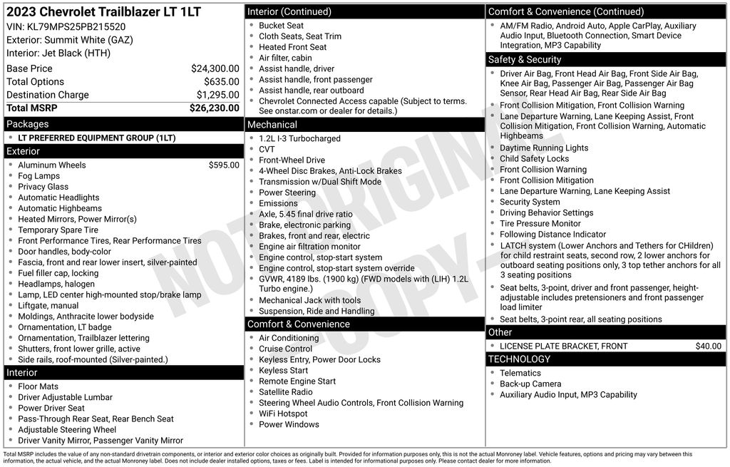 CERTIFIED BY CARFAX - ONE OWNER, REMAINDER OF FACTORY WARRANTY STILL APPLIES, BACKUP CAMERA, BLUETOOTH HANDS FREE, ANDROID AUTO, APPLE CARPLAY, PUSH BUTTON START, CRUISE CONTROL, NON SMOKER, TrailBlazer LT, 4D Sport Utility, 1.2L Ecotec Turbo DOHC DI w/VVT, CVT, FWD, Summit White, Black Cloth, ABS brakes, Electronic Stability Control, Fully automatic headlights, Low tire pressure warning, Steering wheel mounted audio controls, 18" Aluminum Wheels, 2-Way Adjustable Front Head Restraints, 2-Way Power Driver Lumbar Seat Adjuster, 4-Way Manual Front Passenger Seat Adjuster, 4-Wheel Disc Brakes, 5.45 Axle Ratio, 6 Speakers, 6-Speaker Audio System Feature, 7" Diagonal Color Touchscreen, 8-Way Power Driver Seat Adjuster, Air Conditioning, Alloy wheels, AM/FM radio: SiriusXM, Auto High-beam Headlights, Brake assist, Bumpers: body-color, Cloth Seat Trim, Compass, Delay-off headlights, Driver door bin, Driver vanity mirror, Dual front impact airbags, Dual front side impact airbags, Exterior Parking Camera Rear, Flat-Folding Front Passenger Seatback, Front anti-roll bar, Front Bucket Seats, Front Center Armrest, Front fog lights, Front License Plate Bracket, Front reading lights, Front wheel independent suspension, Heated door mirrors, Heated Driver & Front Passenger Seats, Heated front seats, Illuminated entry, Knee airbag, Occupant sensing airbag, Overhead airbag, Overhead console, Panic alarm, Passenger door bin, Passenger vanity mirror, Power door mirrors, Power driver seat, Power steering, Power windows, Preferred Equipment Group 1LT, Radio data system, Radio: Chevrolet Infotainment 3 System, Rear side impact airbag, Rear window defroster, Rear window wiper, Remote keyless entry, Ride & Handling Suspension, Security system, SiriusXM Radio, Speed control, Split folding rear seat, Spoiler, Tachometer, Telescoping steering wheel, Tilt steering wheel, Traction control, Trip computer, Variably intermittent wipers, Wheels: 17" High Gloss Black Machined Aluminum, Wireless Apple CarPlay/Android Auto, TrailBlazer LT, 4D Sport Utility, 1.2L Ecotec Turbo DOHC DI w/VVT, CVT, FWD, Summit White, Black Cloth, ABS brakes, Electronic Stability Control, Fully automatic headlights, Low tire pressure warning, Steering wheel mounted audio controls.