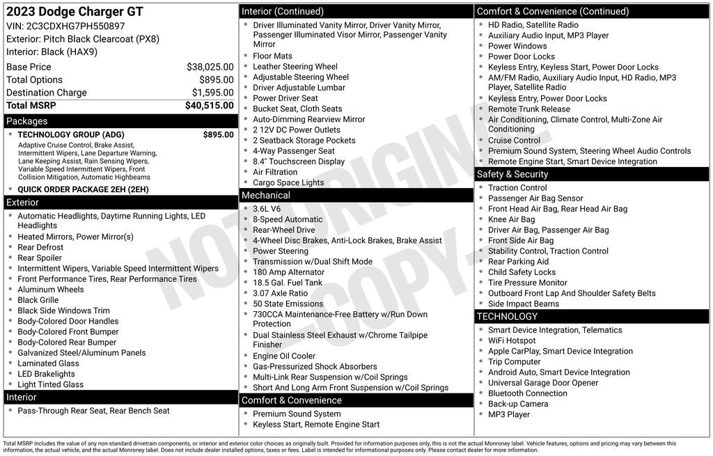 CERTIFIED BY CARFAX - ONE OWNER, BACKUP CAMERA, BLUETOOTH HANDS FREE, ANDROID AUTO, APPLE CARPLAY, POWER SEATS, PUSH BUTTON START, CRUISE CONTROL, NON SMOKER, Charger GT, 4D Sedan, 3.6L V6 24V VVT, 8-Speed Automatic, RWD, Pitch Black Clearcoat, Black Cloth, ABS brakes, Electronic Stability Control, Four wheel independent suspension, Front dual zone A/C, Fully automatic headlights, Low tire pressure warning, 1-Yr SiriusXM Guardian Trial, 2-Piece Shark Fin Antenna, 4-Wheel Disc Brakes, 4G LTE Wi-Fi Hot Spot, 6 Speakers, 8.4" Touchscreen Display, Adaptive Cruise Control w/Stop, Advanced Brake Assist, Air Conditioning, Alloy wheels, AM/FM radio: SiriusXM, Anti-whiplash front head restraints, Apple CarPlay, Apple CarPlay/Android Auto, Auto High Beam Headlamp Control, Auto-dimming Rear-View mirror, Automatic temperature control, Brake assist, Bumpers: body-color, Cloth Performance Seats, Compass, Delay-off headlights, Driver door bin, Driver vanity mirror, Dual front impact airbags, Dual front side impact airbags, For Details, Visit DriveUconnect.com, Front anti-roll bar, Front Bucket Seats, Front Center Armrest, Front reading lights, Full Speed FWD Collision Warn Plus, Garage door transmitter: HomeLink, Google Android Auto, GPS Antenna Input, HD Radio, Heated door mirrors, Illuminated entry, Integrated Center Stack Radio, Integrated Voice Command w/Bluetooth, Knee airbag, Lane Departure Warning Plus, Leather Shift Knob, Media Hub (2 USB, AUX), Occupant sensing airbag, Outside temperature display, Overhead airbag, Overhead console, Panic alarm, ParkView Rear Back-Up Camera, Passenger door bin, Passenger vanity mirror, Power 2-Way Driver Lumbar Adjust, Power 8-Way Driver Seat, Power door mirrors, Power driver seat, Power steering, Power windows, Quick Order Package 2EH, Radio: Uconnect 4C w/8.4" Display, Rain Sensitive Windshield Wipers, Rear anti-roll bar, Rear Armrest w/Cupholder Seat, Rear reading lights, Rear seat center armrest, Rear window defroster, Remote keyless entry, Speed control, Speed-Sensitive Wipers, Split folding rear seat, Spoiler, Steering wheel mounted audio controls, Tachometer, Technology Group, Telescoping steering wheel, Tilt steering wheel, Traction control, Trip computer, USB Host Flip, Variably intermittent wipers, Wheels: 20" x 8" Satin Carbon Painted, Charger GT, 4D Sedan, 3.6L V6 24V VVT, 8-Speed Automatic, RWD, Pitch Black Clearcoat, Black Cloth, ABS brakes, Electronic Stability Control, Four wheel independent suspension, Front dual zone A/C, Fully automatic headlights, Low tire pressure warning.
