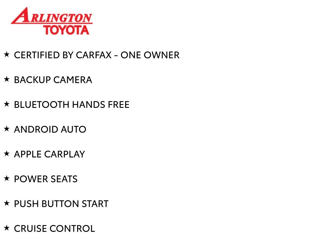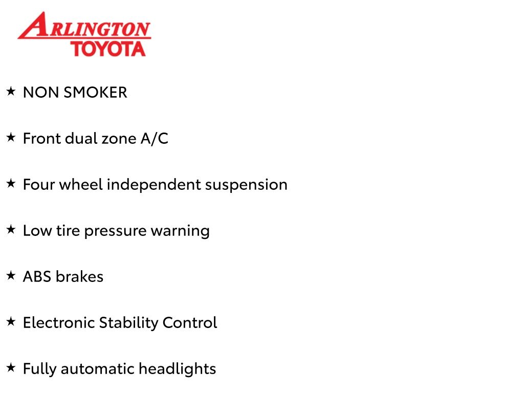 Prices do not include tax, tag, title, a pre-delivery service fee* of $894.00, an electronic registration filing fee* of $199.00 (*these charges represent costs and profits to the dealer for items such as inspecting, cleaning, and preparing documents related to the sale), and an Arlington Toyota Total Value Package of $1,889.00 (*these charges represent costs and profits to the dealer for items such as inspecting, cleaning, and preparing documents related to the sale). The final price is also subject to repair order reconditioning costs. Any price does not include dealer-installed accessories. All offers are mutually exclusive. All vehicles are subject to prior sale. See dealer for complete details.