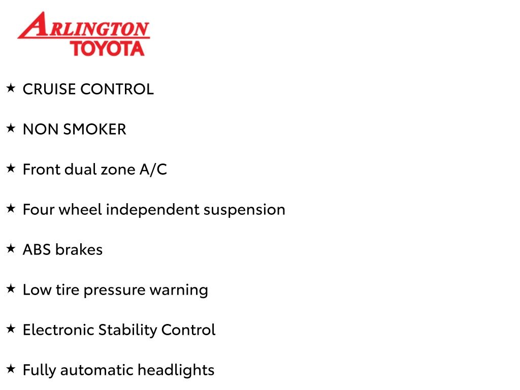 Prices do not include tax, tag, title, a pre-delivery service fee* of $894.00, an electronic registration filing fee* of $199.00 (*these charges represent costs and profits to the dealer for items such as inspecting, cleaning, and preparing documents related to the sale), and an Arlington Toyota Total Value Package of $1,889.00 (*these charges represent costs and profits to the dealer for items such as inspecting, cleaning, and preparing documents related to the sale). The final price is also subject to repair order reconditioning costs. Any price does not include dealer-installed accessories. All offers are mutually exclusive. All vehicles are subject to prior sale. See dealer for complete details.
