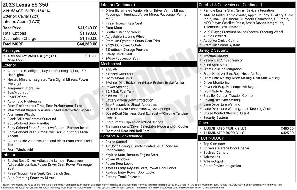 REMAINDER OF FACTORY WARRANTY STILL APPLIES, BACKUP CAMERA, BLUETOOTH HANDS FREE, ANDROID AUTO, APPLE CARPLAY, POWER SEATS, SUNROOF/MOONROOF, PUSH BUTTON START, CRUISE CONTROL, NON SMOKER, ES 350, 4D Sedan, 3.5L V6 DOHC 24V, 8-Speed Automatic, FWD, Caviar, Acorn W/Striated Black Trim Artificial Leather, ABS brakes, Electronic Stability Control, Four wheel independent suspension, Front dual zone A/C, Fully automatic headlights, Low tire pressure warning, 10 Speakers, 10-Way Power Adjustable Front Seats, 4-Wheel Disc Brakes, Accessory Package (Z1), Air Conditioning, Alloy Wheel Locks, Alloy wheels, AM/FM radio: SiriusXM, Auto High-beam Headlights, Auto-dimming door mirrors, Auto-dimming Rear-View mirror, Automatic temperature control, Brake assist, Bumpers: body-color, Cargo Net, Carpet Trunk Mat, Compass, Delay-off headlights, Driver door bin, Driver vanity mirror, Dual front impact airbags, Dual front side impact airbags, Exterior Parking Camera Rear, Front anti-roll bar, Front Bucket Seats, Front Center Armrest, Front reading lights, Garage door transmitter: HomeLink, Heated door mirrors, Illuminated Door Sills, Illuminated entry, Illuminated Trunk Sills, Key Gloves, Knee airbag, Leather Shift Knob, Leather steering wheel, Occupant sensing airbag, Outside temperature display, Overhead airbag, Overhead console, Panic alarm, Passenger door bin, Passenger vanity mirror, Perforated NuLuxe Seat Trim, Power door mirrors, Power driver seat, Power moonroof, Power passenger seat, Power steering, Power windows, Radio data system, Radio: Lexus Interface w/8" Multimedia Touch Scrn, Rear anti-roll bar, Rear reading lights, Rear seat center armrest, Rear side impact airbag, Rear window defroster, Remote keyless entry, Security system, Speed control, Speed-sensing steering, Steering wheel mounted audio controls, Tachometer, Telescoping steering wheel, Tilt steering wheel, Traction control, Trip computer, Turn signal indicator mirrors, Variably intermittent wipers, Wheels: 17" x 7.5J Twin-V-Spoke Alloy, Wireless Apple CarPlay/Wireless Android Auto, ES 350, 4D Sedan, 3.5L V6 DOHC 24V, 8-Speed Automatic, FWD, Caviar, Acorn W/Striated Black Trim Artificial Leather, ABS brakes, Electronic Stability Control, Four wheel independent suspension, Front dual zone A/C, Fully automatic headlights, Low tire pressure warning.