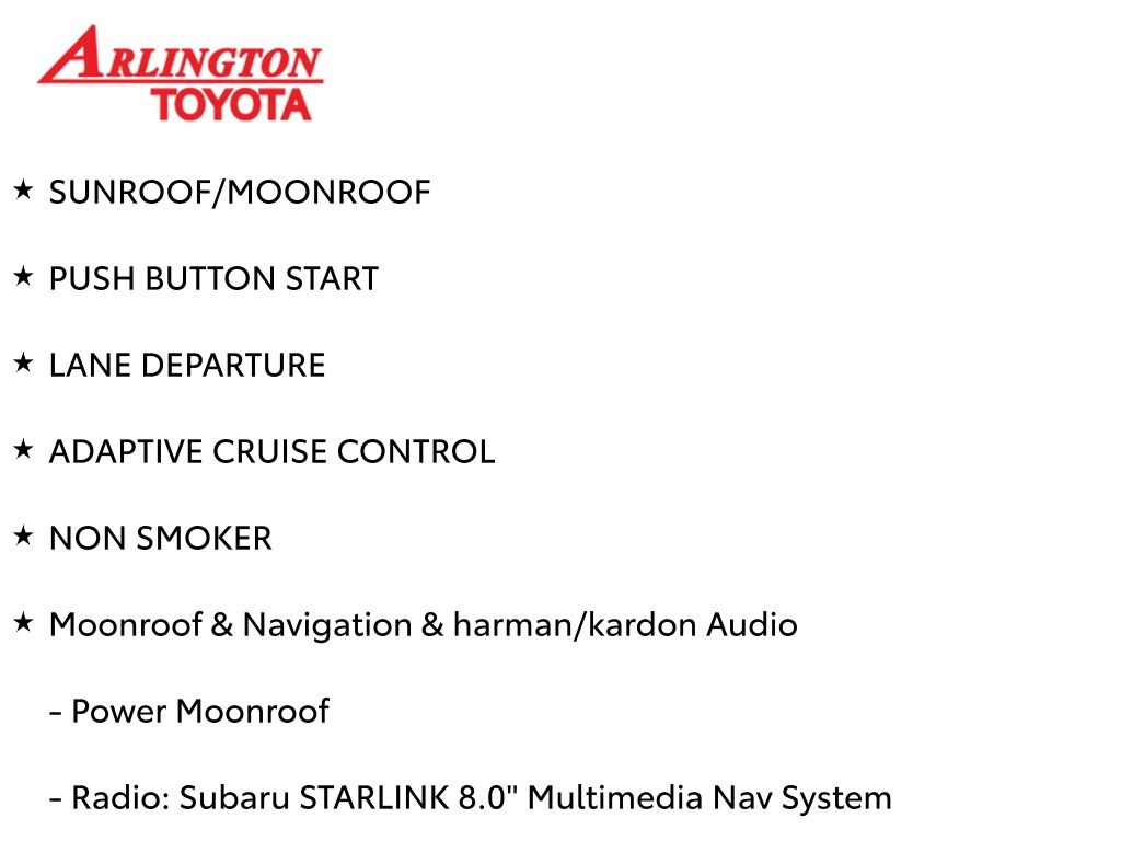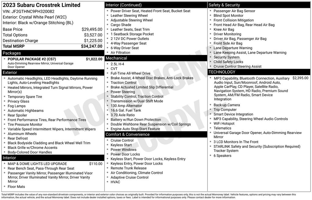 BACKUP CAMERA, BLUETOOTH HANDS FREE, ANDROID AUTO, APPLE CARPLAY, AWD/ALLWHEEL DRIVE, POWER SEATS, NAVIGATION SYSTEM, POWER LIFTGATE, SUNROOF/MOONROOF, PUSH BUTTON START, LANE DEPARTURE, ADAPTIVE CRUISE CONTROL, NON SMOKER, Crosstrek Limited AWD, 4D Sport Utility, 2.5L 4-Cylinder DOHC 16V, Lineartronic CVT, AWD, Crystal White Pearl, Black W/Orange Stitching Leather, ABS brakes, All-Weather Floor Liners, Auto-Dimming Mirror w/Compass & HomeLink, Electronic Stability Control, Four wheel independent suspension, Fully automatic headlights, Low tire pressure warning, Moonroof & Navigation & harman/kardon Audio, Popular Package #2, Power Moonroof, Radio: Subaru STARLINK 8.0" Multimedia Nav System, Rear Bumper Cover, Rear Seatback Protector, Remote keyless entry, Splash Guards, Steering wheel mounted audio controls, 3.70 Axle Ratio, 4-Wheel Disc Brakes, 6 Speakers, Air Conditioning, Alloy wheels, AM/FM radio: SiriusXM, Anti-whiplash front head restraints, Auto High-beam Headlights, Automatic temperature control, Brake assist, Bumpers: body-color, CD player, Driver door bin, Driver vanity mirror, Dual front impact airbags, Dual front side impact airbags, Exterior Parking Camera Rear, Front anti-roll bar, Front Bucket Seats, Front Center Armrest, Front fog lights, Front reading lights, harman/kardon Speaker System, Heated door mirrors, Heated Front Bucket Seats, Heated front seats, Illuminated entry, Knee airbag, Leather-Trimmed Upholstery, Map & Dome Lights LED Upgrade, Occupant sensing airbag, Outside temperature display, Overhead airbag, Overhead console, Panic alarm, Passenger door bin, Passenger vanity mirror, Power door mirrors, Power driver seat, Power steering, Power windows, Radio data system, Radio: Subaru STARLINK 8.0" Multimedia Plus System, Rear anti-roll bar, Rear seat center armrest, Rear window defroster, Rear window wiper, Security system, Speed control, Speed-sensing steering, Split folding rear seat, Spoiler, STARLINK/Apple CarPlay/Android Auto, Tachometer, Telescoping steering wheel, Tilt steering wheel, Traction control, Trip computer, Turn signal indicator mirrors, Variably intermittent wipers, Wheels: 18" x 7.0J Alum Alloy Blk w/Machine Finish, Crosstrek Limited AWD, 4D Sport Utility, 2.5L 4-Cylinder DOHC 16V, Lineartronic CVT, AWD, Crystal White Pearl, Black W/Orange Stitching Leather, ABS brakes, All-Weather Floor Liners, Auto-Dimming Mirror w/Compass & HomeLink, Electronic Stability Control, Four wheel independent suspension, Fully automatic headlights, Low tire pressure warning, Moonroof & Navigation & harman/kardon Audio, Popular Package #2, Power Moonroof, Radio: Subaru STARLINK 8.0" Multimedia Nav System, Rear Bumper Cover, Rear Seatback Protector, Remote keyless entry, Splash Guards, Steering wheel mounted audio controls.