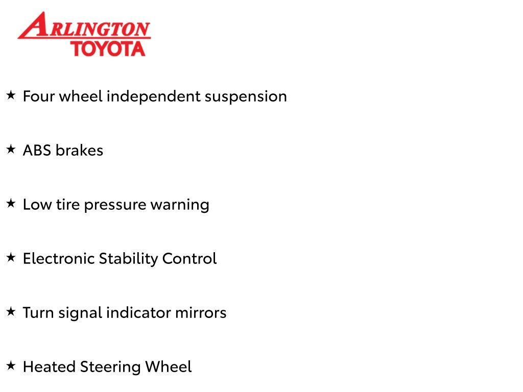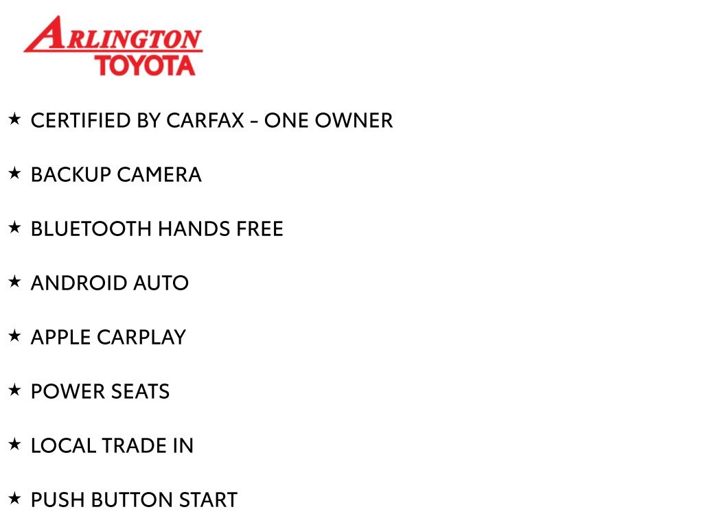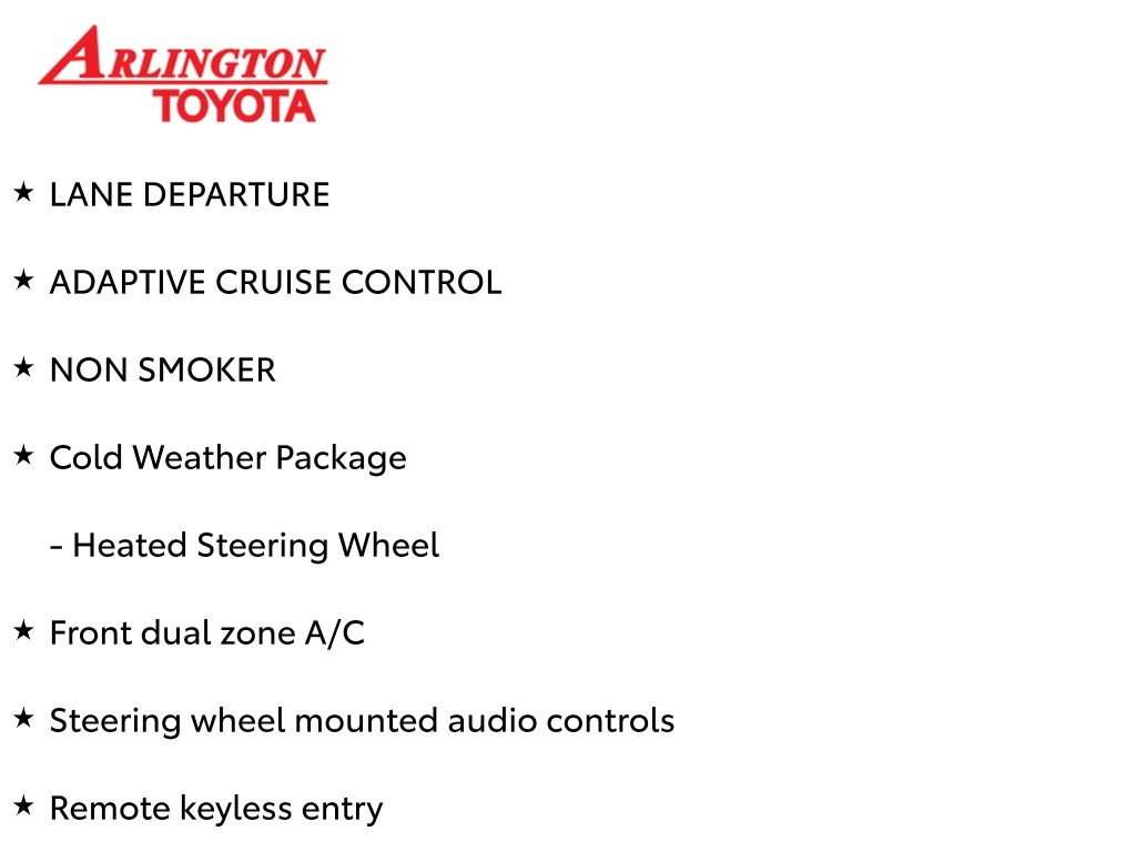 Prices do not include tax, tag, title, a pre-delivery service fee* of $894.00, an electronic registration filing fee* of $199.00 (*these charges represent costs and profits to the dealer for items such as inspecting, cleaning, and preparing documents related to the sale), and an Arlington Toyota Total Value Package of $1,889.00 (*these charges represent costs and profits to the dealer for items such as inspecting, cleaning, and preparing documents related to the sale). The final price is also subject to repair order reconditioning costs. Any price does not include dealer-installed accessories. All offers are mutually exclusive. All vehicles are subject to prior sale. See dealer for complete details.