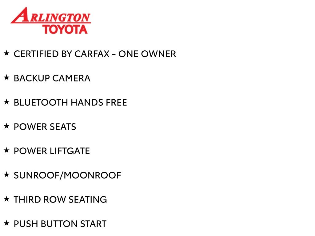 CERTIFIED BY CARFAX - ONE OWNER, BACKUP CAMERA, BLUETOOTH HANDS FREE, POWER SEATS, POWER LIFTGATE, SUNROOF/MOONROOF, THIRD ROW SEATING, PUSH BUTTON START, LANE DEPARTURE, ADAPTIVE CRUISE CONTROL, NON SMOKER, 4D Sport Utility, 2.4L I4 PDI Turbocharged DOHC 16V LEV3-SULEV30 265hp, 8-Speed Automatic, FWD, Celestial Silver Metallic, Graphite w/SofTex Seat Trim, Fully automatic headlights, Turn signal indicator mirrors, 3.329 Axle Ratio, 3rd row seats: split-bench, 4-Wheel Disc Brakes, 6 Speakers, ABS brakes, Air Conditioning, Alloy wheels, AM/FM radio: SiriusXM, Apple CarPlay/Android Auto, Auto High-beam Headlights, Auto-dimming Rear-View mirror, Automatic temperature control, Brake assist, Bumpers: body-color, Delay-off headlights, Driver door bin, Driver vanity mirror, Dual front impact airbags, Dual front side impact airbags, Electronic Stability Control, Emergency communication system: Safety Connect (up to 10-year trial subscription), Exterior Parking Camera Rear, Four wheel independent suspension, Front anti-roll bar, Front Bucket Seats, Front Center Armrest, Front dual zone A/C, Front fog lights, Front reading lights, Garage door transmitter: HomeLink, Heated door mirrors, Heated Front Bucket Seats, Heated front seats, Illuminated entry, Knee airbag, Leather Shift Knob, Leather steering wheel, Low tire pressure warning, Mudguards (TMS), Occupant sensing airbag, Outside temperature display, Overhead airbag, Overhead console, Panic alarm, Passenger door bin, Passenger vanity mirror, Power door mirrors, Power driver seat, Power Liftgate, Power moonroof, Power passenger seat, Power steering, Power windows, Radio: 8" Toyota Audio Multimedia, Rear air conditioning, Rear anti-roll bar, Rear reading lights, Rear window defroster, Rear window wiper, Reclining 3rd row seat, Remote keyless entry, Roof rack: rails only, Security system, SofTex Seat Trim, Speed control, Speed-sensing steering, Split folding rear seat, Spoiler, Steering wheel mounted audio controls, Tachometer, Telescoping steering wheel, Tilt steering wheel, Traction control, Trip computer, Variably intermittent wipers, Wheels: 18" Machined-Finish Alloy, 4D Sport Utility, 2.4L I4 PDI Turbocharged DOHC 16V LEV3-SULEV30 265hp, 8-Speed Automatic, FWD, Celestial Silver Metallic, Graphite w/SofTex Seat Trim, Fully automatic headlights, Turn signal indicator mirrors.