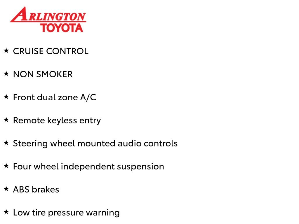 Prices do not include tax, tag, title, a pre-delivery service fee* of $894.00, an electronic registration filing fee* of $199.00 (*these charges represent costs and profits to the dealer for items such as inspecting, cleaning, and preparing documents related to the sale), and an Arlington Toyota Total Value Package of $1,889.00 (*these charges represent costs and profits to the dealer for items such as inspecting, cleaning, and preparing documents related to the sale). The final price is also subject to repair order reconditioning costs. Any price does not include dealer-installed accessories. All offers are mutually exclusive. All vehicles are subject to prior sale. See dealer for complete details.