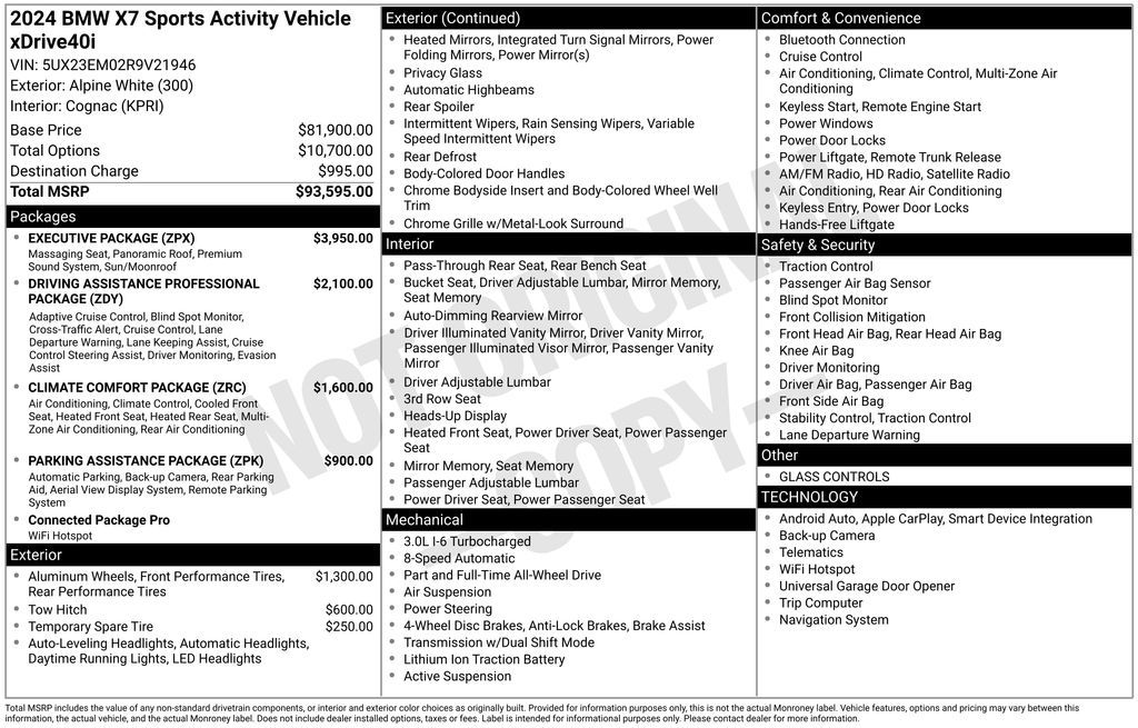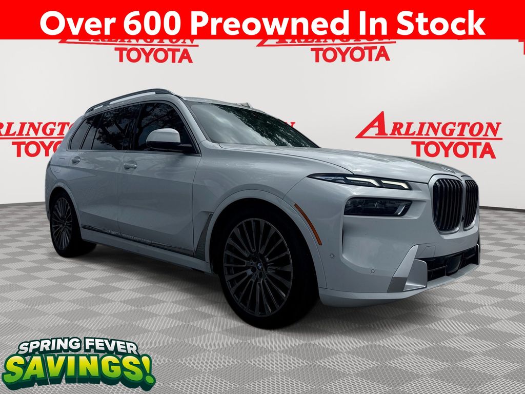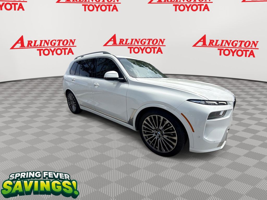 CERTIFIED BY CARFAX - ONE OWNER, BACKUP CAMERA, BLUETOOTH HANDS FREE, ANDROID AUTO, APPLE CARPLAY, AWD/ALLWHEEL DRIVE, POWER SEATS, LOCAL TRADE IN, NAVIGATION SYSTEM, PANORAMIC MOONROOF, POWER LIFTGATE, PUSH BUTTON START, LANE DEPARTURE, ADAPTIVE CRUISE CONTROL, NON SMOKER, X7 xDrive40i AWD, 4D Sport Utility, 3.0L I6 DOHC 24V, 8-Speed Automatic Sport, AWD, Alpine White, Cognac Premium Synthetic, ABS brakes, Active Cruise Control w/Stop & Go, Active Driving Assistant Pro, Active Lane Keeping Assistant, Drive Recorder, Driving Assistance Professional Package, Electronic Stability Control, Executive Package, Four wheel independent suspension, Front Massaging Seats, Fully automatic headlights, Gesture Control, Glass Controls, harman/kardon Surround Sound System, Heated & Cooled Cup Holders, Highway Assistant, Low tire pressure warning, Panoramic Sky Lounge LED Roof, Parking Assistance Package, Parking Assistant Professional, Rear dual zone A/C, Rear Electric Side Window Shades, Soft-Close Automatic Doors, Steering wheel memory, Steering wheel mounted audio controls, Surround View w/3D View, Traffic Jam Assistant, 10 Speakers, 3.64 Axle Ratio, 3rd row seats: split-bench, 4-Wheel Disc Brakes, 5-Zone Automatic Climate Control, Adaptive suspension, Air Conditioning, Alloy wheels, AM/FM radio: SiriusXM with 360L, AM/FM Stereo, Apple CarPlay & Android Auto Compatibility, Apple CarPlay Compatibility, Auto High-beam Headlights, Auto tilt-away steering wheel, Auto-dimming door mirrors, Auto-dimming Rear-View mirror, Auto-leveling suspension, Automatic temperature control, BMW Assist eCall, BMW TeleServices, Brake assist, Bumpers: body-color, Climate Comfort Package, Compass, Connected Package Pro, ConnectedDrive Services, Delay-off headlights, Driver door bin, Driver vanity mirror, Dual front impact airbags, Dual front side impact airbags, Exterior Parking Camera Rear, Front & Rear Heated Seats, Front anti-roll bar, Front Bucket Seats, Front Center Armrest, Front dual zone A/C, Front reading lights, Front Ventilated Seats, Garage door transmitter, Genuine wood console insert, Genuine wood dashboard insert, Genuine wood door panel insert, Head restraints memory, Heads-Up Display, Heated door mirrors, Heated front seats, Heated Multi-Contour Seats, Heated steering wheel, Hi-Fi Sound System, Illuminated entry, Increased Top Speed Limiter, Knee airbag, Leather steering wheel, Live Cockpit Pro, Memory seat, Navigation system: BMW Maps Navigation, Occupant sensing airbag, Outside temperature display, Overhead airbag, Panic alarm, Passenger door bin, Passenger vanity mirror, Personal eSIM 5G, Power adjustable front head restraints, Power door mirrors, Power driver seat, Power Front Seats, Power moonroof: Panorama, Power passenger seat, Power steering, Power windows, Radio data system, Rain sensing wipers, Rear air conditioning, Rear anti-roll bar, Rear reading lights, Rear seat center armrest, Rear window defroster, Rear window wiper, Reclining 3rd row seat, Remote keyless entry, Security system, Sensafin Upholstery, SiriusXM w/360L & 1 Year Platinum Plan Subscription, Speed control, Speed-sensing steering, Speed-Sensitive Wipers, Split folding rear seat, Spoiler, Sport steering wheel, Tachometer, Telescoping steering wheel, Tilt steering wheel, Traction control, Trailer Hitch, Trip computer, Turn signal indicator mirrors, Variably intermittent wipers, Wheels: 21" x 9.5" Y-Spoke Bi-Color, Wheels: 22" x 9.5" Fr & 22" x 10.5" Rr Multi-Spoke, Wireless Charging Device, X7 xDrive40i AWD, 4D Sport Utility, 3.0L I6 DOHC 24V, 8-Speed Automatic Sport, AWD, Alpine White, Cognac Premium Synthetic, ABS brakes, Active Cruise Control w/Stop & Go, Active Driving Assistant Pro, Active Lane Keeping Assistant, Drive Recorder, Driving Assistance Professional Package, Electronic Stability Control, Executive Package, Four wheel independent suspension, Front Massaging Seats, Fully automatic headlights, Gesture Control, Glass Controls, harman