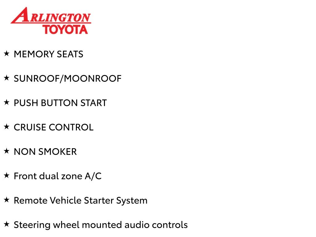 Prices do not include tax, tag, title, a pre-delivery service fee* of $894.00, an electronic registration filing fee* of $199.00 (*these charges represent costs and profits to the dealer for items such as inspecting, cleaning, and preparing documents related to the sale), and an Arlington Toyota Total Value Package of $1,889.00 (*these charges represent costs and profits to the dealer for items such as inspecting, cleaning, and preparing documents related to the sale). The final price is also subject to repair order reconditioning costs. Any price does not include dealer-installed accessories. All offers are mutually exclusive. All vehicles are subject to prior sale. See dealer for complete details.