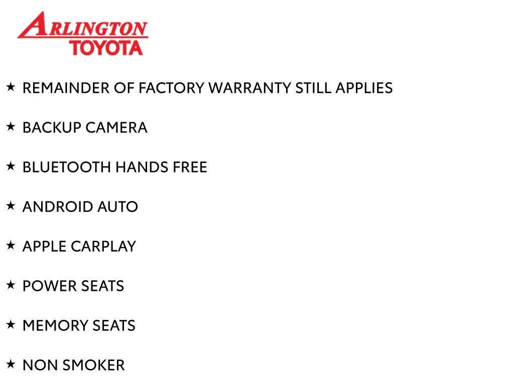 Prices do not include tax, tag, title, a pre-delivery service fee* of $894.00, an electronic registration filing fee* of $199.00 (*these charges represent costs and profits to the dealer for items such as inspecting, cleaning, and preparing documents related to the sale), and an Arlington Toyota Total Value Package of $1,889.00 (*these charges represent costs and profits to the dealer for items such as inspecting, cleaning, and preparing documents related to the sale). The final price is also subject to repair order reconditioning costs. Any price does not include dealer-installed accessories. All offers are mutually exclusive. All vehicles are subject to prior sale. See dealer for complete details.