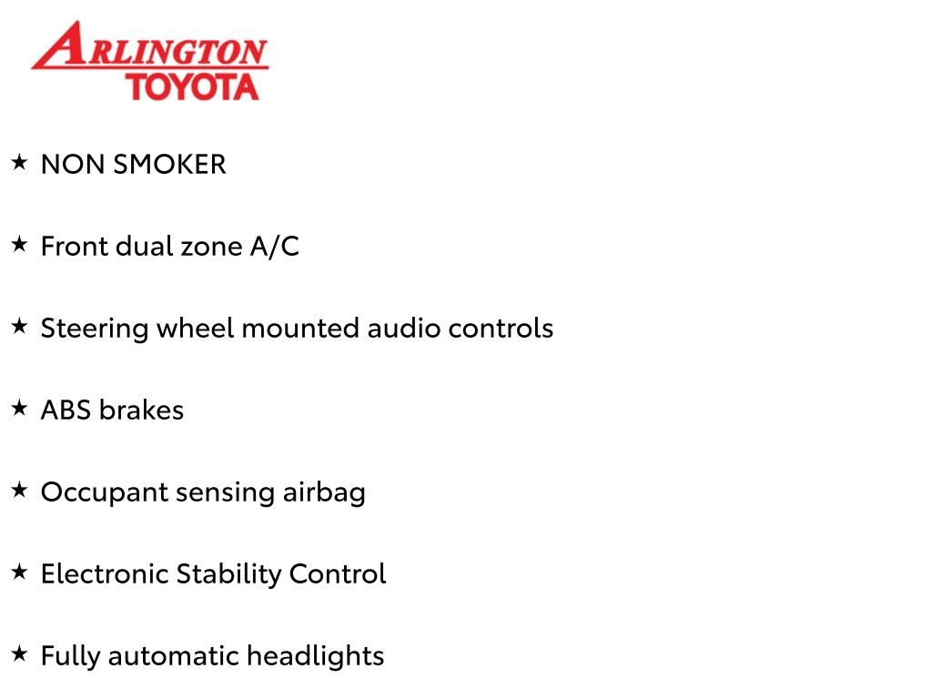 Prices do not include tax, tag, title, a pre-delivery service fee* of $894.00, an electronic registration filing fee* of $199.00 (*these charges represent costs and profits to the dealer for items such as inspecting, cleaning, and preparing documents related to the sale), and an Arlington Toyota Total Value Package of $1,889.00 (*these charges represent costs and profits to the dealer for items such as inspecting, cleaning, and preparing documents related to the sale). The final price is also subject to repair order reconditioning costs. Any price does not include dealer-installed accessories. All offers are mutually exclusive. All vehicles are subject to prior sale. See dealer for complete details.