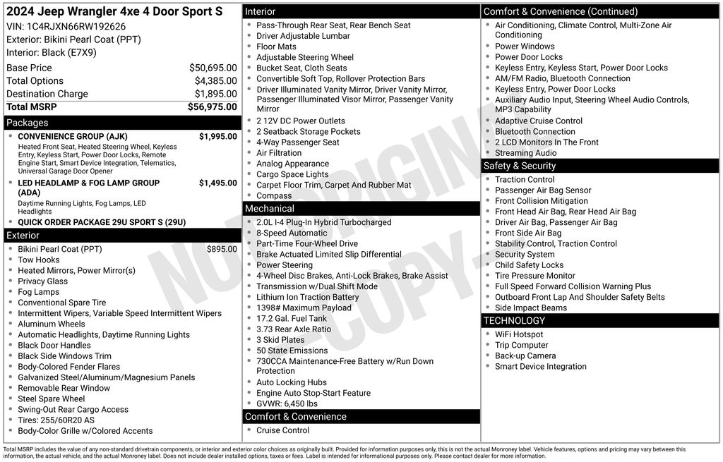REMAINDER OF FACTORY WARRANTY STILL APPLIES, BACKUP CAMERA, BLUETOOTH HANDS FREE, ANDROID AUTO, APPLE CARPLAY, 4X4/FOUR WHEEL DRIVE, PUSH BUTTON START, CRUISE CONTROL, NON SMOKER, Wrangler Sport S 4xe 4X4, 4D Sport Utility, 2.0L I4 DOHC, 8-Speed Automatic, 4WD, Bikini Pearl Coat, Black Cloth, ABS brakes, Electronic Stability Control, Front dual zone A/C, Fully automatic headlights, Occupant sensing airbag, Steering wheel mounted audio controls, 2-Door Passive Entry, Front Door Locks, 3.73 Rear Axle Ratio, 4-Wheel Disc Brakes, 8 Speakers, Air Conditioning, Alloy wheels, Apple CarPlay/Android Auto, Automatic temperature control, Brake assist, Cloth Low-Back Bucket Seats, Compass, Convenience Group, Delay-off headlights, Driver door bin, Driver vanity mirror, Dual front impact airbags, Dual front side impact airbags, Emergency/Assistance Call, Front anti-roll bar, Front Bucket Seats, Front Center Armrest w/Storage, Front fog lights, Front LED Fog Lamps, Front reading lights, Heated door mirrors, Heated Front Seats, Heated Steering Wheel, Illuminated entry, LED Headlamp & Fog Lamp Group, LED Premium Reflector Headlamps, Low tire pressure warning, Outside temperature display, Overhead airbag, Panic alarm, ParkView Rear Back-Up Camera, Passenger door bin, Passenger vanity mirror, Power door mirrors, Power steering, Power windows, Quick Order Package 29U Sport S, Radio data system, Radio: Uconnect 5 w/12.3" Display, Rear anti-roll bar, Rear reading lights, Remote keyless entry, Remote Start System, Security system, Speed control, Split folding rear seat, Sport Suspension, Tachometer, Telescoping steering wheel, Tilt steering wheel, Traction control, Trip computer, Universal Garage Door Opener, Variably intermittent wipers, Voltmeter, Wheels: 20" x 8" Machined/Painted Gray, Wrangler Sport S 4xe 4X4, 4D Sport Utility, 2.0L I4 DOHC, 8-Speed Automatic, 4WD, Bikini Pearl Coat, Black Cloth, ABS brakes, Electronic Stability Control, Front dual zone A/C, Fully automatic headlights, Occupant sensing airbag, Steering wheel mounted audio controls.