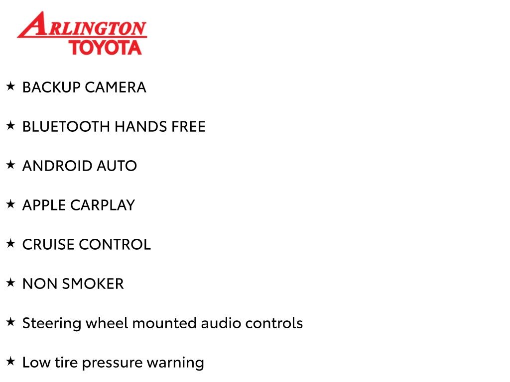Prices do not include tax, tag, title, a pre-delivery service fee* of $894.00, an electronic registration filing fee* of $199.00 (*these charges represent costs and profits to the dealer for items such as inspecting, cleaning, and preparing documents related to the sale), and an Arlington Toyota Total Value Package of $1,889.00 (*these charges represent costs and profits to the dealer for items such as inspecting, cleaning, and preparing documents related to the sale). The final price is also subject to repair order reconditioning costs. Any price does not include dealer-installed accessories. All offers are mutually exclusive. All vehicles are subject to prior sale. See dealer for complete details.