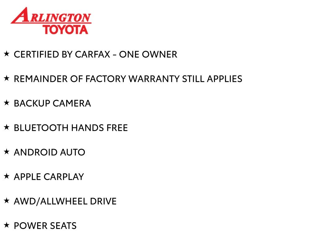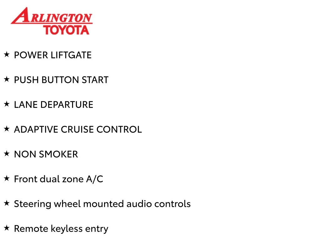 Prices do not include tax, tag, title, a pre-delivery service fee* of $894.00, an electronic registration filing fee* of $199.00 (*these charges represent costs and profits to the dealer for items such as inspecting, cleaning, and preparing documents related to the sale), and an Arlington Toyota Total Value Package of $1,889.00 (*these charges represent costs and profits to the dealer for items such as inspecting, cleaning, and preparing documents related to the sale). The final price is also subject to repair order reconditioning costs. Any price does not include dealer-installed accessories. All offers are mutually exclusive. All vehicles are subject to prior sale. See dealer for complete details.
