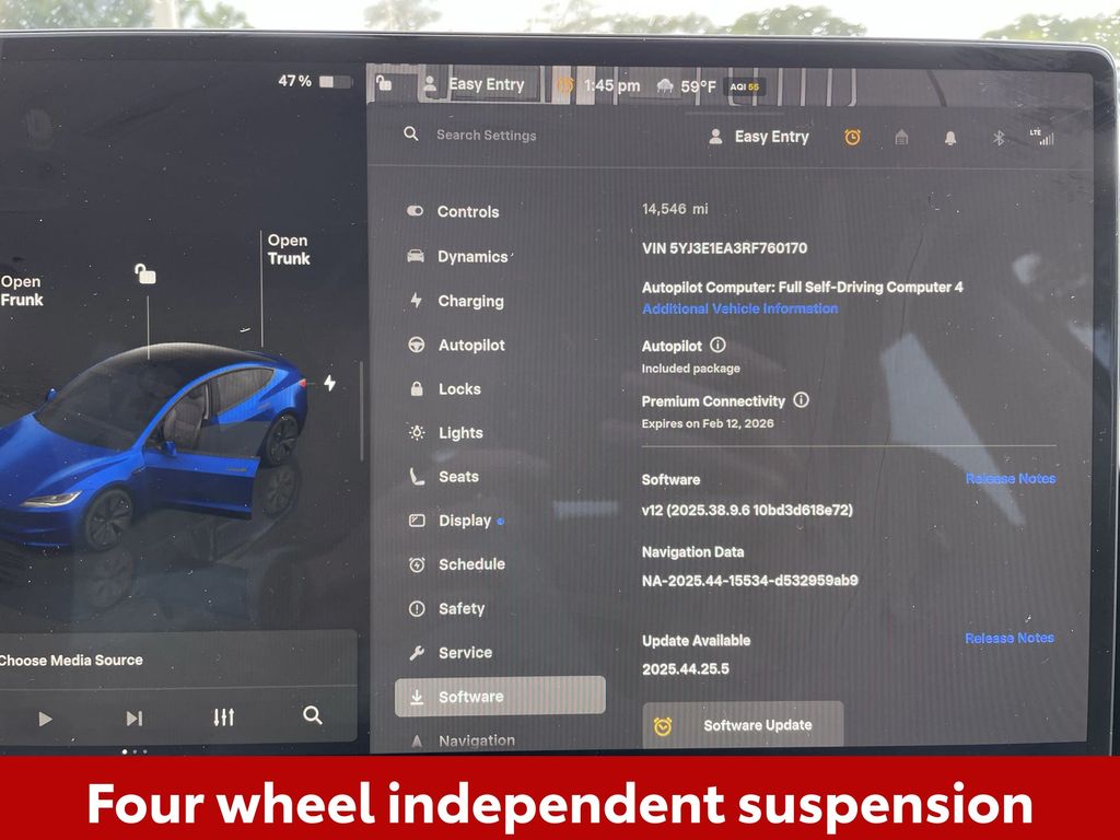 REMAINDER OF FACTORY WARRANTY STILL APPLIES, BACKUP CAMERA, BLUETOOTH HANDS FREE, BLIND SPOT MONITORING, POWER SEATS, MEMORY SEATS, NAVIGATION SYSTEM, LANE DEPARTURE, ADAPTIVE CRUISE CONTROL, NON SMOKER, 4D Sedan, Electric Motor, 1-Speed Automatic, RWD, Deep Blue Metallic, Black w/Vegan Leather Seat Trim, ABS brakes, Electronic Stability Control, Four wheel independent suspension, Front dual zone A/C, Fully automatic headlights, Low tire pressure warning, Steering wheel mounted A/C controls, Steering wheel mounted audio controls, 4-Wheel Disc Brakes, 9 Speakers, Air Conditioning, Alloy wheels, Audio memory, Auto High-beam Headlights, Auto-dimming door mirrors, Auto-dimming Rear-View mirror, Automatic temperature control, Brake assist, Bumpers: body-color, Compass, Delay-off headlights, Driver door bin, Driver vanity mirror, Dual front impact airbags, Dual front side impact airbags, Emergency communication system, Exterior Parking Camera Rear, Front anti-roll bar, Front Bucket Seats, Front Center Armrest w/Storage, Front reading lights, Heated & Ventilated Front Bucket Seats, Heated door mirrors, Heated front seats, Heated rear seats, Heated steering wheel, HVAC memory, Illuminated entry, Knee airbag, Lane Departure Warning System, Memory seat, Navigation System, Occupant sensing airbag, Outside temperature display, Overhead airbag, Passenger door bin, Passenger vanity mirror, Power door mirrors, Power driver seat, Power passenger seat, Power steering, Power windows, Radio data system, Radio: Custom Audio System, Rain sensing wipers, Rear air conditioning, Rear audio controls, Rear reading lights, Rear seat center armrest, Rear window defroster, Security system, Speed control, Speed-sensing steering, Split folding rear seat, Steering wheel memory, Telescoping steering wheel, Tilt steering wheel, Traction control, Trip computer, Variably intermittent wipers, Vegan Leather Seat Trim, Wheels: 18" x 8.5" Photon, 4D Sedan, Electric Motor, 1-Speed Automatic, RWD, Deep Blue Metallic, Black w/Vegan Leather Seat Trim, ABS brakes, Electronic Stability Control, Four wheel independent suspension, Front dual zone A/C, Fully automatic headlights, Low tire pressure warning, Steering wheel mounted A/C controls, Steering wheel mounted audio controls.