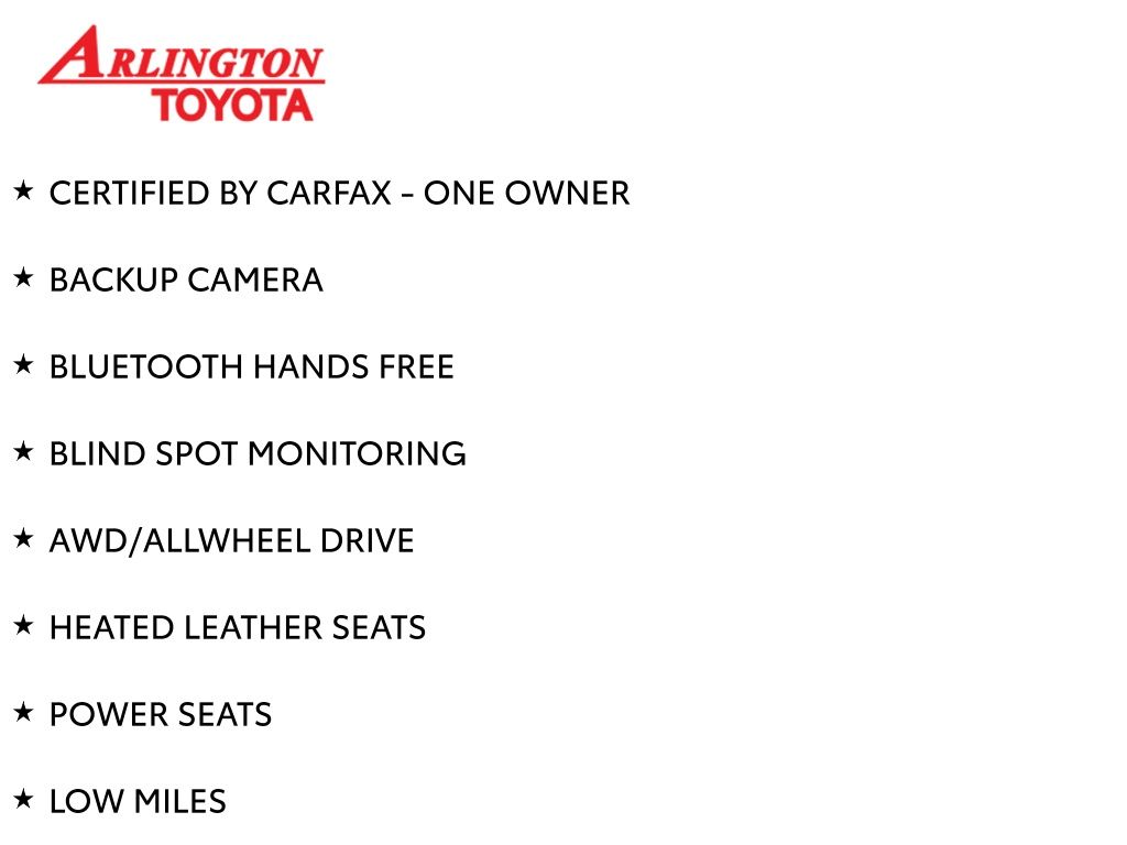 CERTIFIED BY CARFAX - ONE OWNER, BACKUP CAMERA, BLUETOOTH HANDS FREE, BLIND SPOT MONITORING, AWD/ALLWHEEL DRIVE, HEATED LEATHER SEATS, POWER SEATS, LOW MILES, NAVIGATION SYSTEM, LANE DEPARTURE, CRUISE CONTROL, 14 Speakers, 4-Wheel Disc Brakes, 5 Seat Interior, 9.0 Axle Ratio, ABS brakes, Air Conditioning, Alloy wheels, Audio memory, Auto High-beam Headlights, Auto tilt-away steering wheel, Auto-dimming door mirrors, Auto-dimming Rear-View mirror, Automatic temperature control, Brake assist, Bumpers: body-color, Compass, Delay-off headlights, Driver door bin, Driver vanity mirror, Dual front impact airbags, Dual front side impact airbags, Electronic Stability Control, Emergency communication system, Exterior Parking Camera Rear, Four wheel independent suspension, Front anti-roll bar, Front Bucket Seats, Front Center Armrest, Front dual zone A/C, Front fog lights, Front reading lights, Fully automatic headlights, Genuine wood dashboard insert, Heated door mirrors, Heated front seats, Heated rear seats, Heated steering wheel, HVAC memory, Illuminated entry, Knee airbag, Lane Departure Warning System, Low tire pressure warning, Memory seat, Navigation System, Occupant sensing airbag, Outside temperature display, Overhead airbag, Passenger door bin, Passenger vanity mirror, Power door mirrors, Power driver seat, Power Liftgate, Power passenger seat, Power steering, Power windows, Radio data system, Radio: Premium Audio System w/13 Speakers, Rain sensing wipers, Rear reading lights, Rear seat center armrest, Rear window defroster, Security system, Speed control, Speed-sensing steering, Split folding rear seat, Steering wheel memory, Steering wheel mounted A/C controls, Steering wheel mounted audio controls, Telescoping steering wheel, Tilt steering wheel, Traction control, Trip computer, Variably intermittent wipers, Vegan Leather Seat Trim, Wheels: 19" x 9.5" Gemini Dark.
