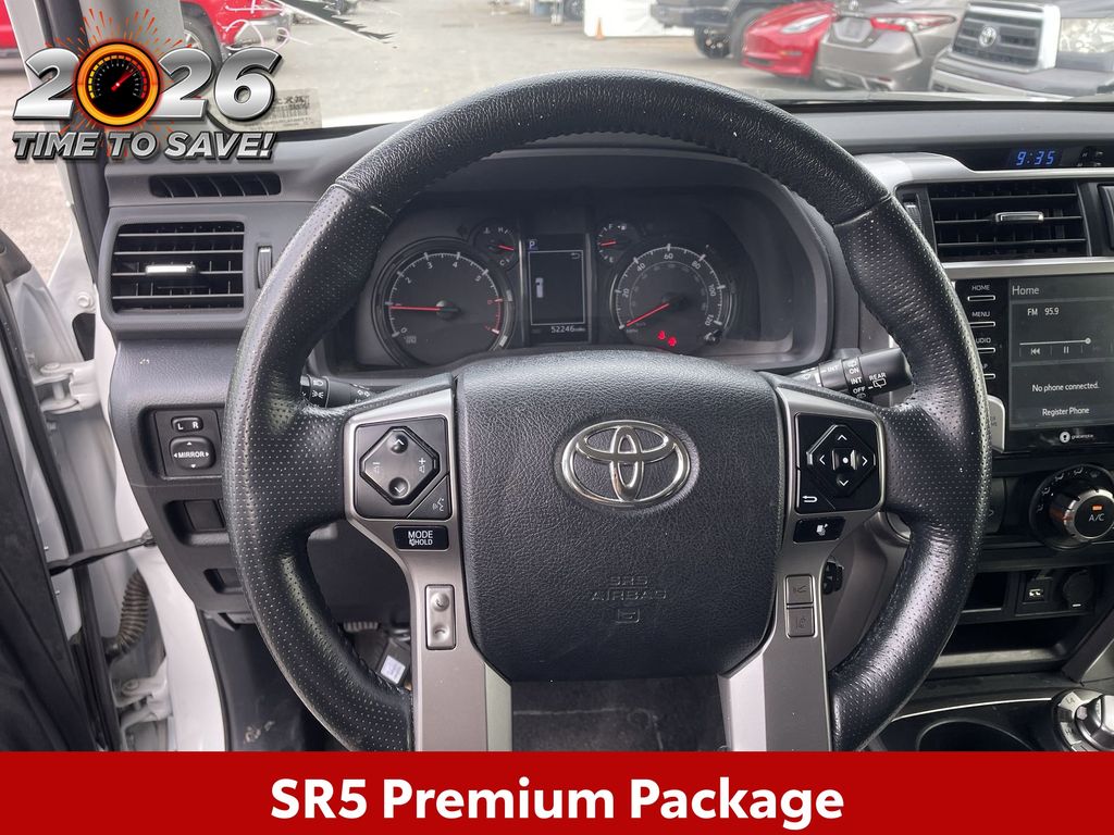 BACKUP CAMERA, BLUETOOTH HANDS FREE, ANDROID AUTO, APPLE CARPLAY, 4X4/FOUR WHEEL DRIVE, POWER SEATS, NAVIGATION SYSTEM, TOW PACKAGE, PUSH BUTTON START, LANE DEPARTURE, ADAPTIVE CRUISE CONTROL, NON SMOKER, 4Runner SR5 Premium 4x4, 4D Sport Utility, 4.0L V6 DOHC 24V, 5-Speed with ECT, 4WD, Ice Cap, Black/Graphite w/SofTex Seat Trim, ABS brakes, Electronic Stability Control, Garage Door Opener, Heated Outside Rear-View Mirrors, Low tire pressure warning, Remote keyless entry, SR5 Premium Package, Steering wheel mounted audio controls, 17" 6-Spoke Alloy Wheels, 3.727 Axle Ratio, 4-Wheel Disc Brakes, 8 Speakers, Air Conditioning, Alloy wheels, AM/FM radio: SiriusXM, Anti-whiplash front head restraints, Apple CarPlay/Android Auto, Auto High-beam Headlights, Auto-dimming Rear-View mirror, Brake assist, Bumpers: body-color, Compass, Driver door bin, Driver vanity mirror, Dual front impact airbags, Dual front side impact airbags, Exterior Parking Camera Rear, Front anti-roll bar, Front Bucket Seats, Front Center Armrest, Front fog lights, Front reading lights, Front wheel independent suspension, Garage door transmitter: HomeLink, Heated door mirrors, Heated Front Bucket Seats, Heated front seats, Heated steering wheel, Illuminated entry, Knee airbag, Leather Shift Knob, Leather steering wheel, Navigation System, Occupant sensing airbag, Outside temperature display, Overhead airbag, Overhead console, Panic alarm, Passenger door bin, Passenger vanity mirror, Power door mirrors, Power driver seat, Power passenger seat, Power steering, Power windows, Radio: Premium Audio, Rear anti-roll bar, Rear seat center armrest, Rear window defroster, Rear window wiper, Rigid Running Boards, Security system, SofTex Seat Trim, Speed control, Speed-sensing steering, Split folding rear seat, Spoiler, Tachometer, Telescoping steering wheel, Tilt steering wheel, Traction control, Trip computer, Turn signal indicator mirrors, Variably intermittent wipers, 4Runner SR5 Premium 4x4, 4D Sport Utility, 4.0L V6 DOHC 24V, 5-Speed with ECT, 4WD, Ice Cap, Black/Graphite w/SofTex Seat Trim, ABS brakes, Electronic Stability Control, Garage Door Opener, Heated Outside Rear-View Mirrors, Low tire pressure warning, Remote keyless entry, SR5 Premium Package, Steering wheel mounted audio controls.