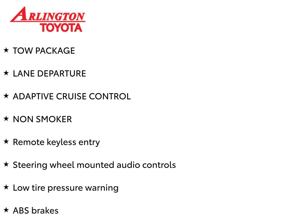 Prices do not include tax, tag, title, a pre-delivery service fee* of $894.00, an electronic registration filing fee* of $199.00 (*these charges represent costs and profits to the dealer for items such as inspecting, cleaning, and preparing documents related to the sale), and an Arlington Toyota Total Value Package of $1,889.00 (*these charges represent costs and profits to the dealer for items such as inspecting, cleaning, and preparing documents related to the sale). The final price is also subject to repair order reconditioning costs. Any price does not include dealer-installed accessories. All offers are mutually exclusive. All vehicles are subject to prior sale. See dealer for complete details.
