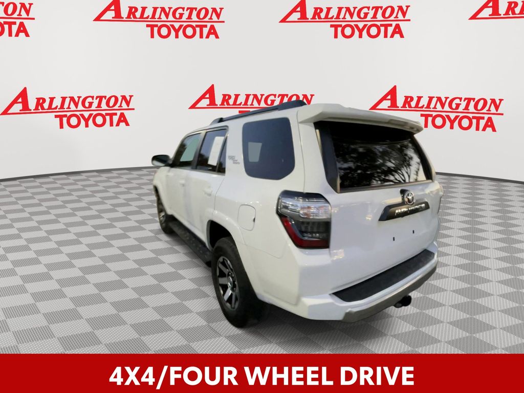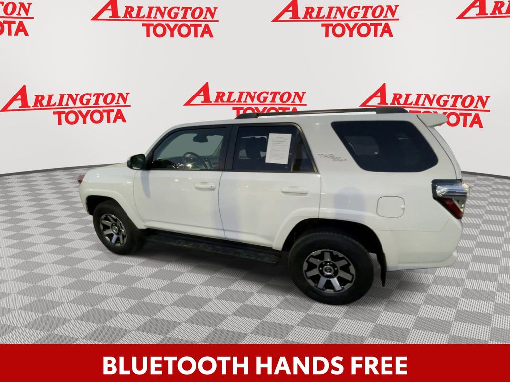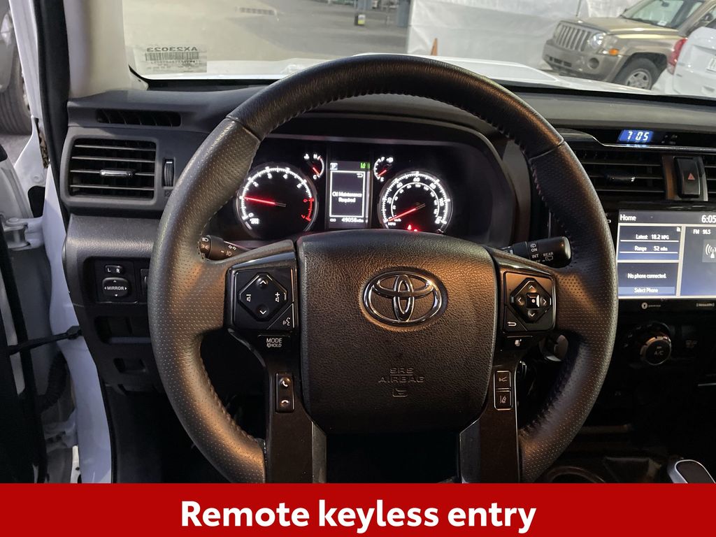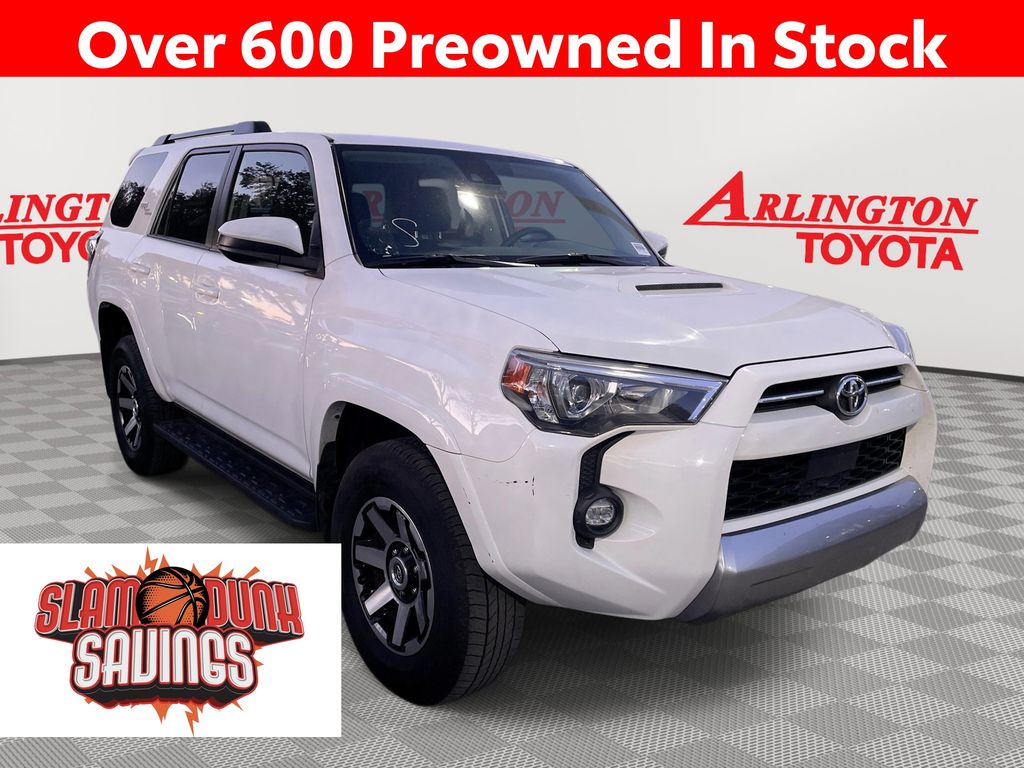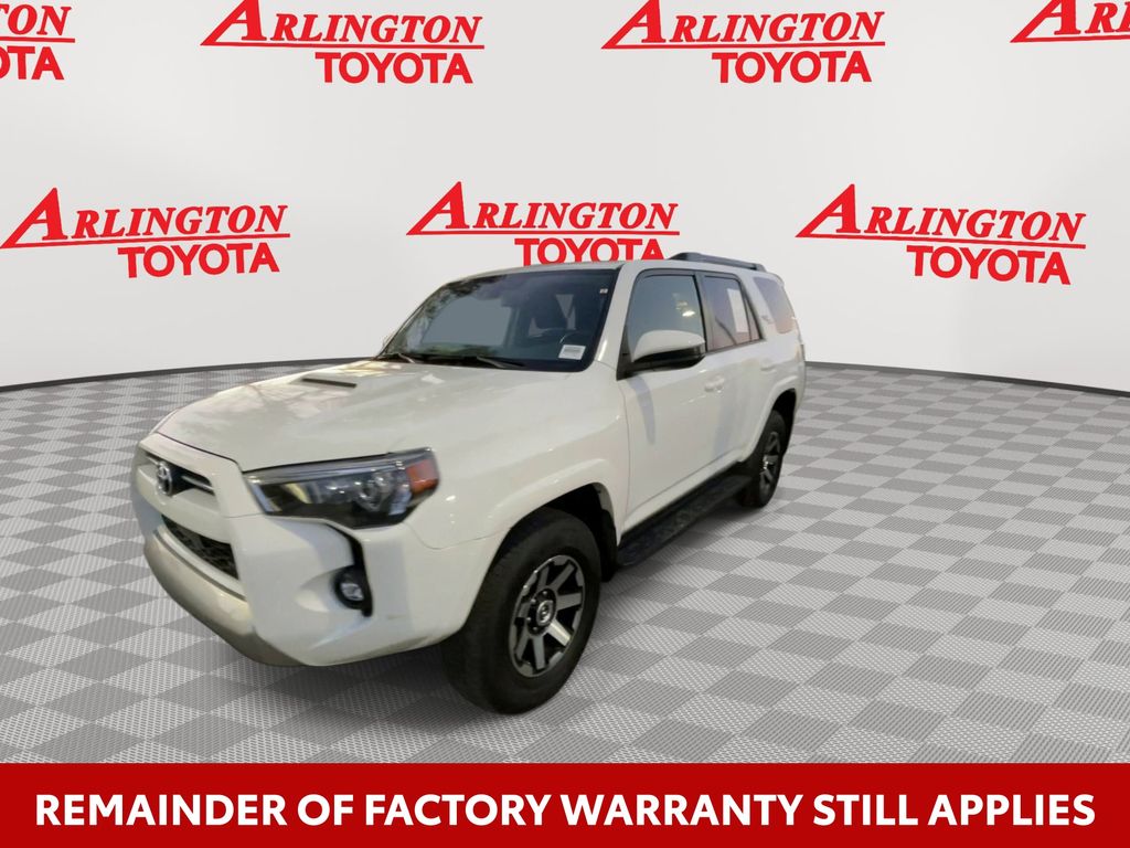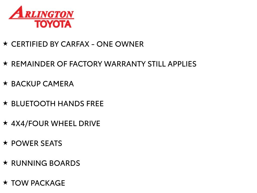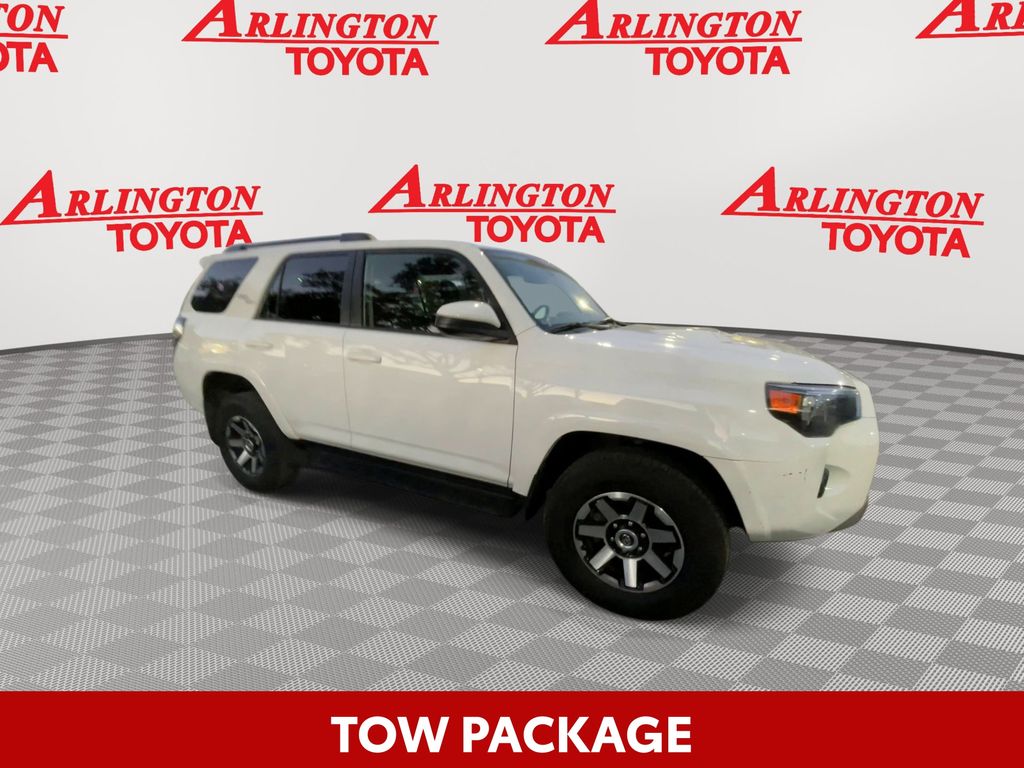 CERTIFIED BY CARFAX - ONE OWNER, REMAINDER OF FACTORY WARRANTY STILL APPLIES, BACKUP CAMERA, BLUETOOTH HANDS FREE, 4X4/FOUR WHEEL DRIVE, POWER SEATS, RUNNING BOARDS, TOW PACKAGE, LANE DEPARTURE, ADAPTIVE CRUISE CONTROL, NON SMOKER, 4Runner TRD Off-Road 4X4, 4D Sport Utility, 4.0L V6 DOHC 24V, 5-Speed with ECT, 4WD, Ice Cap, Graphite Cloth, ABS brakes, Electronic Stability Control, Low tire pressure warning, Remote keyless entry, Steering wheel mounted audio controls, 3.727 Axle Ratio, 4-Wheel Disc Brakes, 8 Speakers, Air Conditioning, Alloy wheels, AM/FM radio: SiriusXM, Anti-whiplash front head restraints, Apple CarPlay/Android Auto, Auto High-beam Headlights, Black Roof Rails, Brake assist, Bumpers: body-color, Compass, Driver door bin, Driver vanity mirror, Dual front impact airbags, Dual front side impact airbags, Exterior Parking Camera Rear, Fabric Seat Trim, Front anti-roll bar, Front Bucket Seats, Front Center Armrest, Front fog lights, Front reading lights, Front wheel independent suspension, Heated door mirrors, Illuminated entry, Knee airbag, Leather Shift Knob, Occupant sensing airbag, Off Road Package, Outside temperature display, Overhead airbag, Overhead console, Panic alarm, Passenger door bin, Passenger vanity mirror, Power door mirrors, Power driver seat, Power steering, Power windows, Radio: Audio Plus, Rear anti-roll bar, Rear seat center armrest, Rear window defroster, Rear window wiper, Rigid Running Boards, Security system, Speed control, Speed-sensing steering, Split folding rear seat, Spoiler, Tachometer, Telescoping steering wheel, Tilt steering wheel, Traction control, Trip computer, Variably intermittent wipers, Wheels: 17" Unique 7-Spoke Off-Road Alloy, 4Runner TRD Off-Road 4X4, 4D Sport Utility, 4.0L V6 DOHC 24V, 5-Speed with ECT, 4WD, Ice Cap, Graphite Cloth, ABS brakes, Electronic Stability Control, Low tire pressure warning, Remote keyless entry, Steering wheel mounted audio controls.