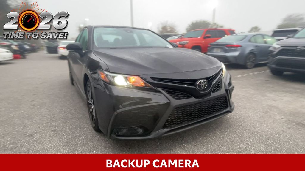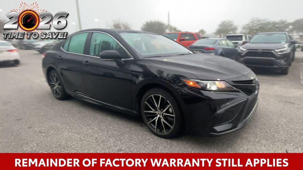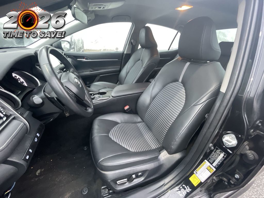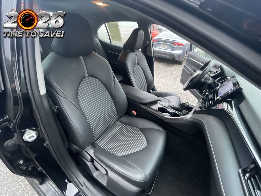 REMAINDER OF FACTORY WARRANTY STILL APPLIES, BACKUP CAMERA, BLUETOOTH HANDS FREE, ANDROID AUTO, APPLE CARPLAY, POWER SEATS, LANE DEPARTURE, ADAPTIVE CRUISE CONTROL, NON SMOKER, Camry SE, 4D Sedan, 2.5L I4 DOHC 16V, 8-Speed Automatic, FWD, Midnight Black Metallic, Black w/Sport SofTex Seat Trim w/Fabric Inserts, 18" x 8J Alloy Wheels, 4-Wheel Disc Brakes, 6 Speakers, ABS brakes, Air Conditioning, Alloy wheels, AM/FM radio: SiriusXM, Apple CarPlay/Android Auto, Auto High-beam Headlights, Automatic temperature control, Brake assist, Bumpers: body-color, Delay-off headlights, Driver door bin, Driver vanity mirror, Dual front impact airbags, Dual front side impact airbags, Electronic Stability Control, Emergency communication system: Safety Connect (1-year trial), Exterior Parking Camera Rear, Four wheel independent suspension, Front anti-roll bar, Front Bucket Seats, Front Center Armrest, Front dual zone A/C, Front reading lights, Fully automatic headlights, Heated door mirrors, Illuminated entry, Knee airbag, Leather steering wheel, Low tire pressure warning, Occupant sensing airbag, Outside temperature display, Overhead airbag, Overhead console, Panic alarm, Passenger door bin, Passenger vanity mirror, Power door mirrors, Power driver seat, Power steering, Power windows, Radio data system, Radio: Audio, Rear anti-roll bar, Rear seat center armrest, Rear side impact airbag, Rear window defroster, Remote keyless entry, Security system, Speed control, Speed-sensing steering, Split folding rear seat, Spoiler, Sport SofTex Seat Trim w/Fabric Inserts, Steering wheel mounted audio controls, Tachometer, Telescoping steering wheel, Tilt steering wheel, Traction control, Trip computer, Turn signal indicator mirrors, Variably intermittent wipers, Camry SE, 4D Sedan, 2.5L I4 DOHC 16V, 8-Speed Automatic, FWD, Midnight Black Metallic, Black w/Sport SofTex Seat Trim w/Fabric Inserts.