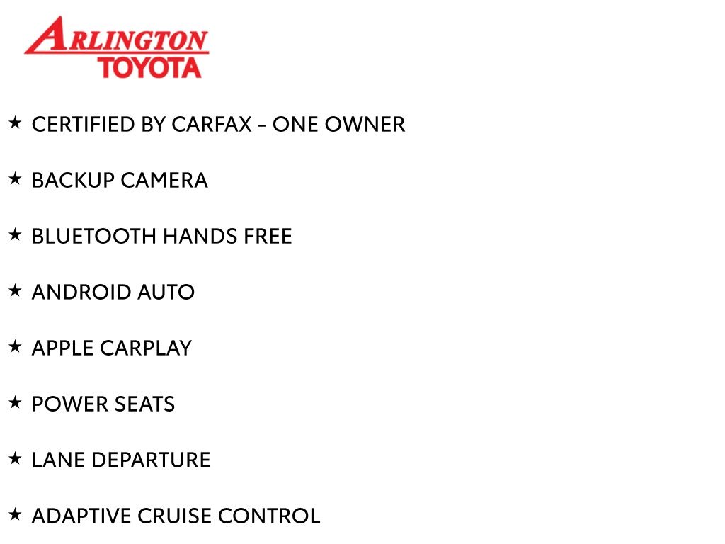 Prices do not include tax, tag, title, a pre-delivery service fee* of $894.00, an electronic registration filing fee* of $199.00 (*these charges represent costs and profits to the dealer for items such as inspecting, cleaning, and preparing documents related to the sale), and an Arlington Toyota Total Value Package of $1,889.00 (*these charges represent costs and profits to the dealer for items such as inspecting, cleaning, and preparing documents related to the sale). The final price is also subject to repair order reconditioning costs. Any price does not include dealer-installed accessories. All offers are mutually exclusive. All vehicles are subject to prior sale. See dealer for complete details.