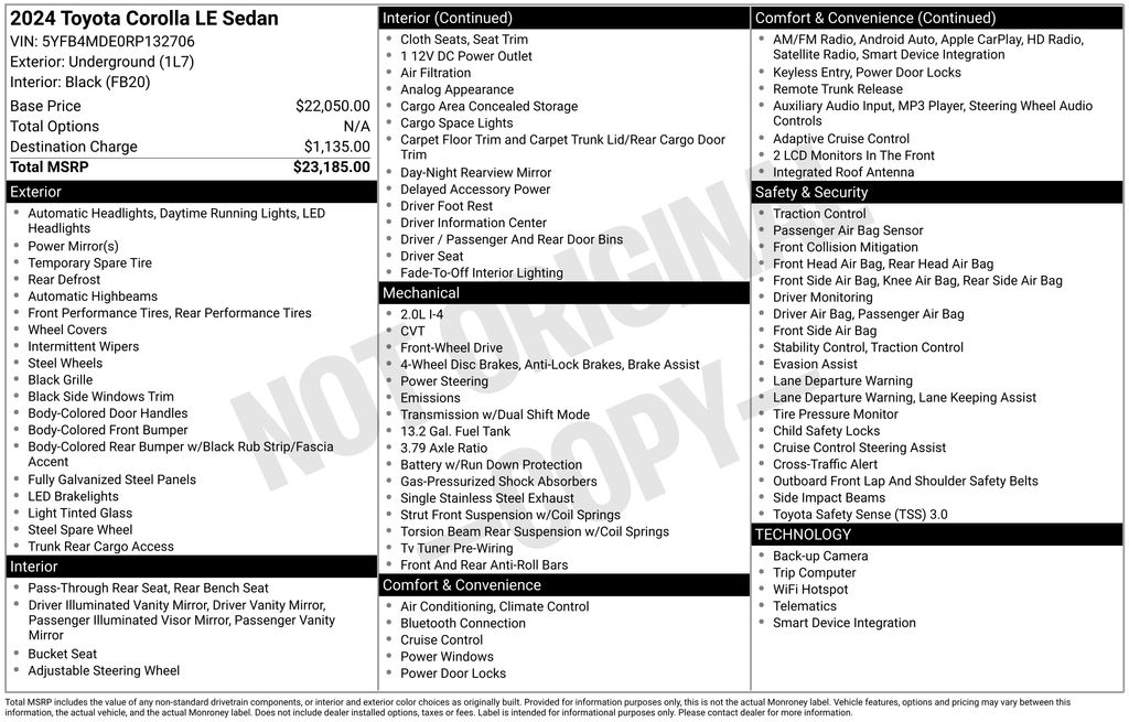 CERTIFIED BY CARFAX - ONE OWNER, REMAINDER OF FACTORY WARRANTY STILL APPLIES, BACKUP CAMERA, BLUETOOTH HANDS FREE, ANDROID AUTO, APPLE CARPLAY, LANE DEPARTURE, ADAPTIVE CRUISE CONTROL, NON SMOKER, Corolla LE, 4D Sedan, 2.0L I4 DOHC 16V, CVT, FWD, Underground, Black Cloth, ABS brakes, Low tire pressure warning, Steering wheel mounted audio controls, 16" Steel Wheels w/Covers, 4-Wheel Disc Brakes, 6 Speakers, Air Conditioning, AM/FM radio: SiriusXM, Auto High-beam Headlights, Automatic temperature control, Brake assist, Bumpers: body-color, Delay-off headlights, Driver door bin, Driver vanity mirror, Dual front impact airbags, Dual front side impact airbags, Electronic Stability Control, Exterior Parking Camera Rear, Fabric Seat Trim, Front anti-roll bar, Front Bucket Seats, Front Center Armrest, Front reading lights, Front wheel independent suspension, Fully automatic headlights, Illuminated entry, Knee airbag, Occupant sensing airbag, Outside temperature display, Overhead airbag, Panic alarm, Passenger door bin, Passenger vanity mirror, Power door mirrors, Power steering, Power windows, Radio data system, Radio: 8" Toyota Audio Multimedia, Rear anti-roll bar, Rear seat center armrest, Rear side impact airbag, Rear window defroster, Remote keyless entry, Speed control, Split folding rear seat, Tachometer, Telescoping steering wheel, Tilt steering wheel, Traction control, Trip computer, Corolla LE, 4D Sedan, 2.0L I4 DOHC 16V, CVT, FWD, Underground, Black Cloth, ABS brakes, Low tire pressure warning, Steering wheel mounted audio controls.