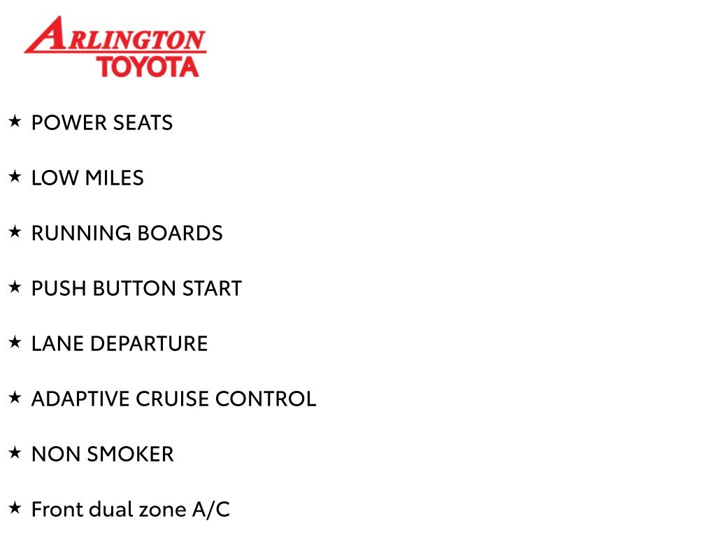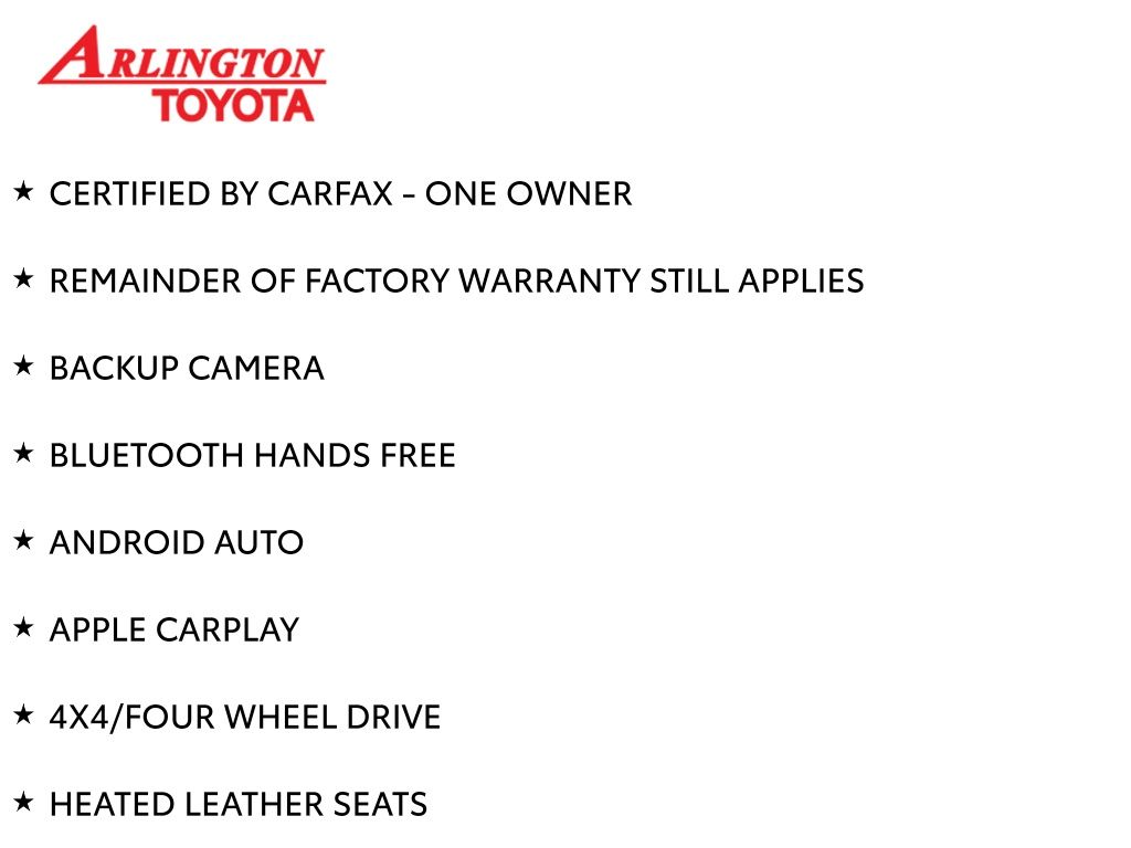 CERTIFIED BY CARFAX - ONE OWNER, REMAINDER OF FACTORY WARRANTY STILL APPLIES, BACKUP CAMERA, BLUETOOTH HANDS FREE, ANDROID AUTO, APPLE CARPLAY, 4X4/FOUR WHEEL DRIVE, HEATED LEATHER SEATS, POWER SEATS, LOW MILES, RUNNING BOARDS, PUSH BUTTON START, LANE DEPARTURE, ADAPTIVE CRUISE CONTROL, NON SMOKER, 4D Sport Utility, 2.4L 4-Cylinder, 8-Speed Automatic, 4WD, Ice Cap, Black w/SofTex Synthetic Leather Seat Trim or Leather Seat Trim, 18" x 7.5J Alloy Wheels, ABS brakes, Alloy wheels, Compass, Electronic Stability Control, Front dual zone A/C, Fully automatic headlights, Heated & Ventilated Front Seats, Heated door mirrors, Heated front seats, Illuminated entry, Low tire pressure warning, Power Liftgate, Remote keyless entry, Steering wheel mounted audio controls, Traction control, Turn signal indicator mirrors, 10 Speakers, 4-Wheel Disc Brakes, Air Conditioning, AM/FM radio: SiriusXM, Apple CarPlay/Android Auto, Auto High-beam Headlights, Auto tilt-away steering wheel, Auto-dimming Rear-View mirror, Automatic temperature control, Axle Ratio: TBD, Brake assist, Delay-off headlights, Driver door bin, Driver vanity mirror, Dual front impact airbags, Dual front side impact airbags, Exterior Parking Camera Rear, Front anti-roll bar, Front Bucket Seats, Front Center Armrest, Front fog lights, Front reading lights, Front wheel independent suspension, Garage door transmitter: HomeLink, Heated steering wheel, Knee airbag, Leather Shift Knob, Leather steering wheel, Navigation system: Drive Connect Cloud Navigation (1-year trial subscription), Occupant sensing airbag, Outside temperature display, Overhead airbag, Overhead console, Panic alarm, Passenger door bin, Passenger vanity mirror, Power door mirrors, Power driver seat, Power steering, Power windows, Radio data system, Radio: Toyota Audio Multimedia System, Rain sensing wipers, Rear air conditioning, Rear anti-roll bar, Rear reading lights, Rear seat center armrest, Rear window defroster, Rear window wiper, Security system, SofTex Synthetic Leather Seat Trim, Speed control, Speed-sensing steering, Split folding rear seat, Spoiler, Telescoping steering wheel, Tilt steering wheel, Trip computer, Variably intermittent wipers, Ventilated front seats, 4D Sport Utility, 2.4L 4-Cylinder, 8-Speed Automatic, 4WD, Ice Cap, Black w/SofTex Synthetic Leather Seat Trim or Leather Seat Trim, 18" x 7.5J Alloy Wheels, ABS brakes, Alloy wheels, Compass, Electronic Stability Control, Front dual zone A/C, Fully automatic headlights, Heated & Ventilated Front Seats, Heated door mirrors, Heated front seats, Illuminated entry, Low tire pressure warning, Power Liftgate, Remote keyless entry, Steering wheel mounted audio controls, Traction control, Turn signal indicator mirrors.