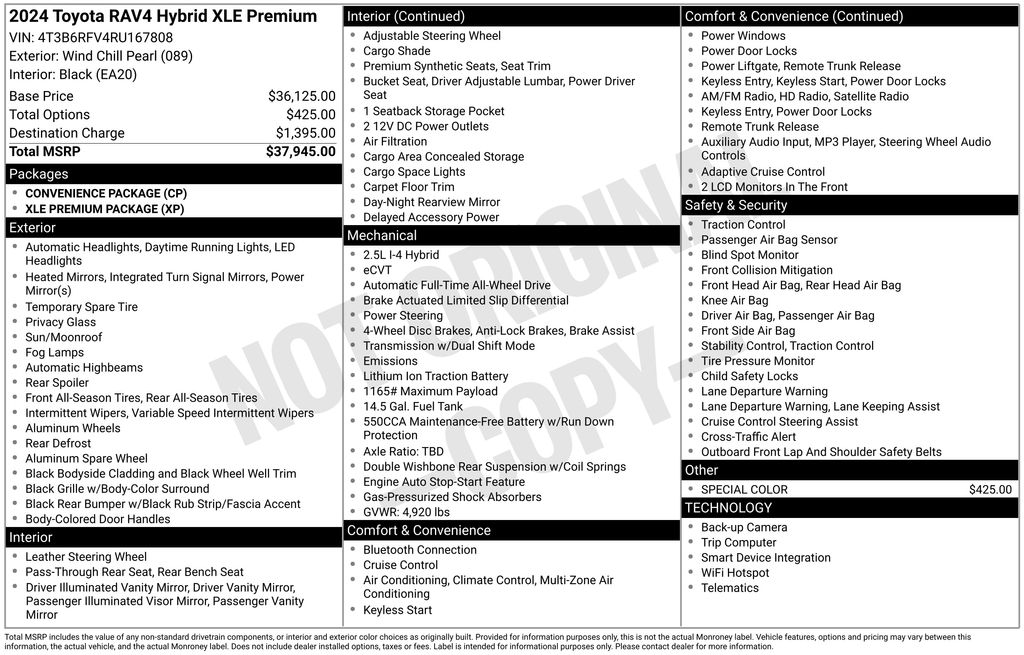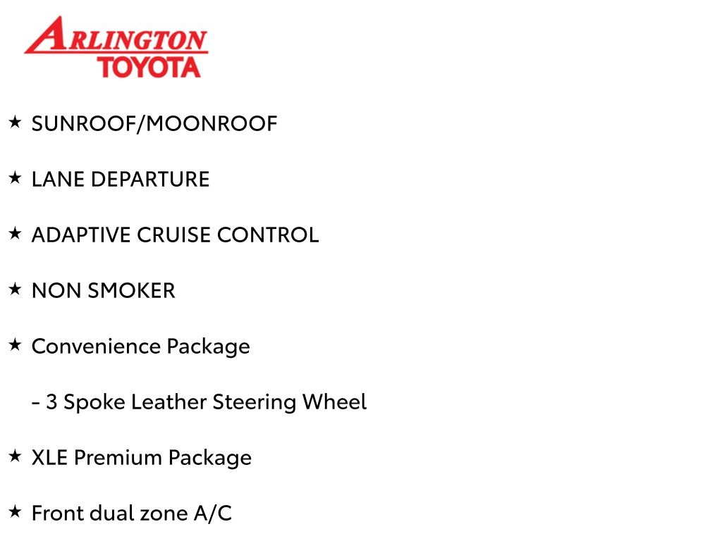 Prices do not include tax, tag, title, a pre-delivery service fee* of $894.00, an electronic registration filing fee* of $199.00 (*these charges represent costs and profits to the dealer for items such as inspecting, cleaning, and preparing documents related to the sale), and an Arlington Toyota Total Value Package of $1,889.00 (*these charges represent costs and profits to the dealer for items such as inspecting, cleaning, and preparing documents related to the sale). The final price is also subject to repair order reconditioning costs. Any price does not include dealer-installed accessories. All offers are mutually exclusive. All vehicles are subject to prior sale. See dealer for complete details.