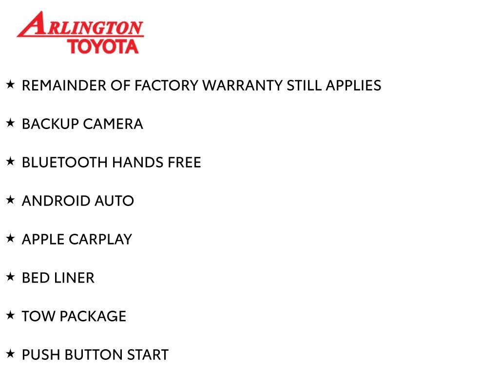 REMAINDER OF FACTORY WARRANTY STILL APPLIES, BACKUP CAMERA, BLUETOOTH HANDS FREE, ANDROID AUTO, APPLE CARPLAY, BED LINER, TOW PACKAGE, PUSH BUTTON START, LANE DEPARTURE, ADAPTIVE CRUISE CONTROL, NON SMOKER, Tacoma TRD Sport, 4D Double Cab, 2.4L 4-Cylinder, 8-Speed Automatic, RWD, Bronze Oxide, Boulder/Black Cloth, ABS brakes, Four wheel independent suspension, Fully automatic headlights, Low tire pressure warning, 3.583 Axle Ratio, 4-Wheel Disc Brakes, 6 Speakers, Air Conditioning, Alloy wheels, AM/FM radio: SiriusXM, Anti-whiplash front head restraints, Apple CarPlay/Android Auto, Auto High-beam Headlights, Auto-dimming Rear-View mirror, Automatic temperature control, Brake assist, Bumpers: body-color, Driver door bin, Driver vanity mirror, Dual front impact airbags, Dual front side impact airbags, Electronic Stability Control, Exterior Parking Camera Rear, Fabric Seat Trim (FE), Front anti-roll bar, Front Bucket Seats, Front Center Armrest, Front fog lights, Front reading lights, Heated door mirrors, Illuminated entry, Knee airbag, Leather Shift Knob, Leather steering wheel, Occupant sensing airbag, Outside temperature display, Overhead airbag, Overhead console, Panic alarm, Passenger door bin, Passenger vanity mirror, Power door mirrors, Power steering, Power windows, Radio: 14" Toyota Audio Multimedia (EE), Radio: 8" Toyota Audio Multimedia, Rear step bumper, Rear window defroster, Remote keyless entry, Security system, Speed control, Speed-sensing steering, Split folding rear seat, Spray-On Bed Liner (TMS), Steering wheel mounted audio controls, Tachometer, Telescoping steering wheel, Tilt steering wheel, Traction control, Trip computer, Turn signal indicator mirrors, Variably intermittent wipers, Wheels: 18" TRD Sport Alloy, Tacoma TRD Sport, 4D Double Cab, 2.4L 4-Cylinder, 8-Speed Automatic, RWD, Bronze Oxide, Boulder/Black Cloth, ABS brakes, Four wheel independent suspension, Fully automatic headlights, Low tire pressure warning.