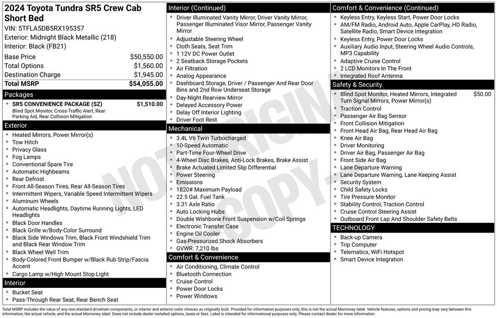 REMAINDER OF FACTORY WARRANTY STILL APPLIES, BACKUP CAMERA, BLUETOOTH HANDS FREE, ANDROID AUTO, APPLE CARPLAY, 4X4/FOUR WHEEL DRIVE, LANE DEPARTURE, ADAPTIVE CRUISE CONTROL, NON SMOKER, Tundra SR5 XP PACKAGE 4X4, 4D CrewMax, 3.4L V6, 10-Speed Automatic, 4WD, Midnight Black, Black Cloth, ABS brakes, Electronic Stability Control, Fully automatic headlights, Low tire pressure warning, Steering wheel mounted audio controls, 18" Alloy Wheels, 3.31 Axle Ratio, 32 Gallon Fuel Tank, 4-Way Adjustable Front Bucket Seats, 4-Wheel Disc Brakes, 9 Speakers, Air Conditioning, Alloy wheels, AM/FM radio: SiriusXM, Apple CarPlay/Android Auto, Auto High-beam Headlights, Automatic temperature control, Blind Spot Monitor, Blind Spot Monitor w/Lane Change Assist, Brake assist, Bumpers: body-color, Delay-off headlights, Driver door bin, Driver vanity mirror, Dual front impact airbags, Dual front side impact airbags, Exterior Parking Camera Rear, Fabric Seat Trim (FB), Front anti-roll bar, Front Bucket Seats, Front Center Armrest, Front fog lights, Front reading lights, Front wheel independent suspension, Heated door mirrors, Heated Power Black Outside Mirrors, Illuminated entry, Knee airbag, Occupant sensing airbag, Outside temperature display, Overhead airbag, Overhead console, Panic alarm, Parking Support Alert/Brake, Passenger door bin, Passenger vanity mirror, Power door mirrors, Power steering, Power windows, Radio data system, Radio: Audio Multimedia System, Rear reading lights, Rear step bumper, Rear window defroster, Remote keyless entry, Safety Connect, Security system, Speed control, Speed-sensing steering, Split folding rear seat, SR5 Convenience Package, Tachometer, Telescoping steering wheel, Tilt steering wheel, Traction control, Trip computer, Variably intermittent wipers, Voltmeter, Tundra SR5 XP PACKAGE 4X4, 4D CrewMax, 3.4L V6, 10-Speed Automatic, 4WD, Midnight Black, Black Cloth, ABS brakes, Electronic Stability Control, Fully automatic headlights, Low tire pressure warning, Steering wheel mounted audio controls.