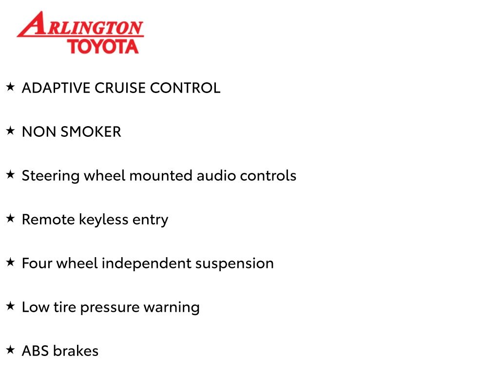 Prices do not include tax, tag, title, a pre-delivery service fee* of $894.00, an electronic registration filing fee* of $199.00 (*these charges represent costs and profits to the dealer for items such as inspecting, cleaning, and preparing documents related to the sale), and an Arlington Toyota Total Value Package of $1,889.00 (*these charges represent costs and profits to the dealer for items such as inspecting, cleaning, and preparing documents related to the sale). The final price is also subject to repair order reconditioning costs. Any price does not include dealer-installed accessories. All offers are mutually exclusive. All vehicles are subject to prior sale. See dealer for complete details.