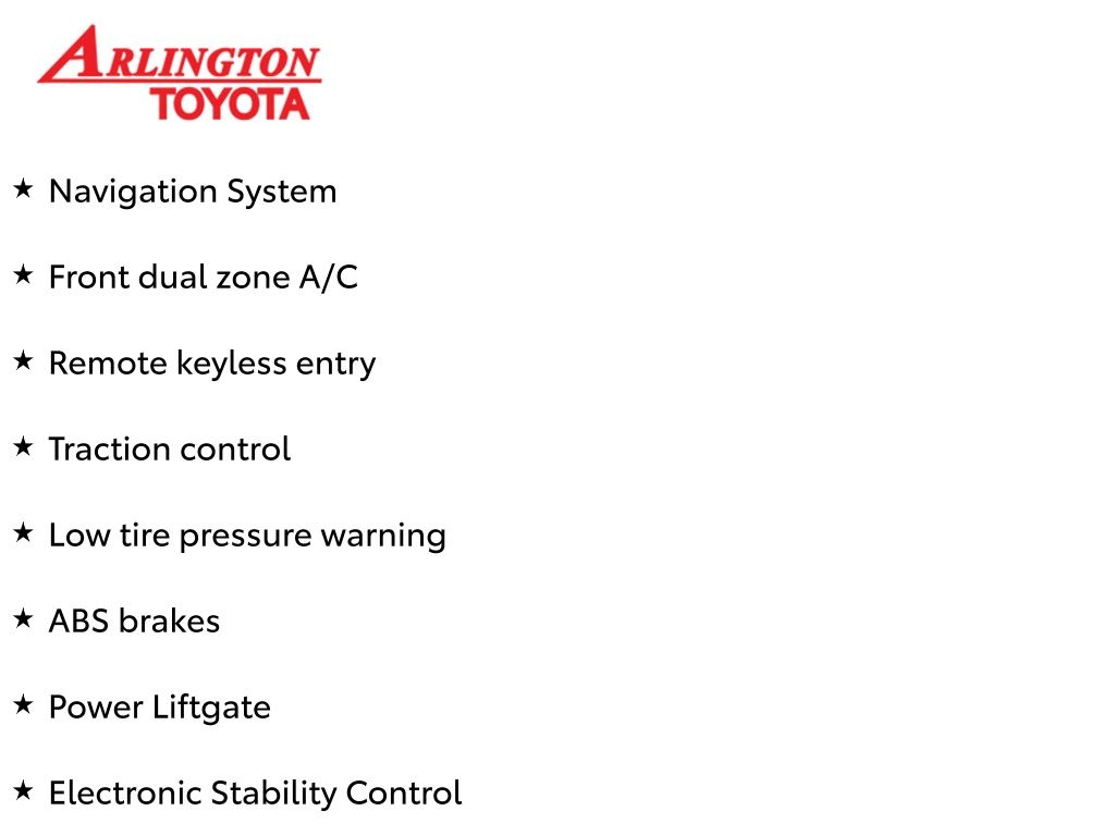 ABS brakes, Active Cruise Control, Alloy wheels, Electronic Stability Control, Front dual zone A/C, Heated door mirrors, Heated Front Seats, Heated front seats, Illuminated entry, Low tire pressure warning, Navigation System, Power Liftgate, Remote keyless entry, Traction control.